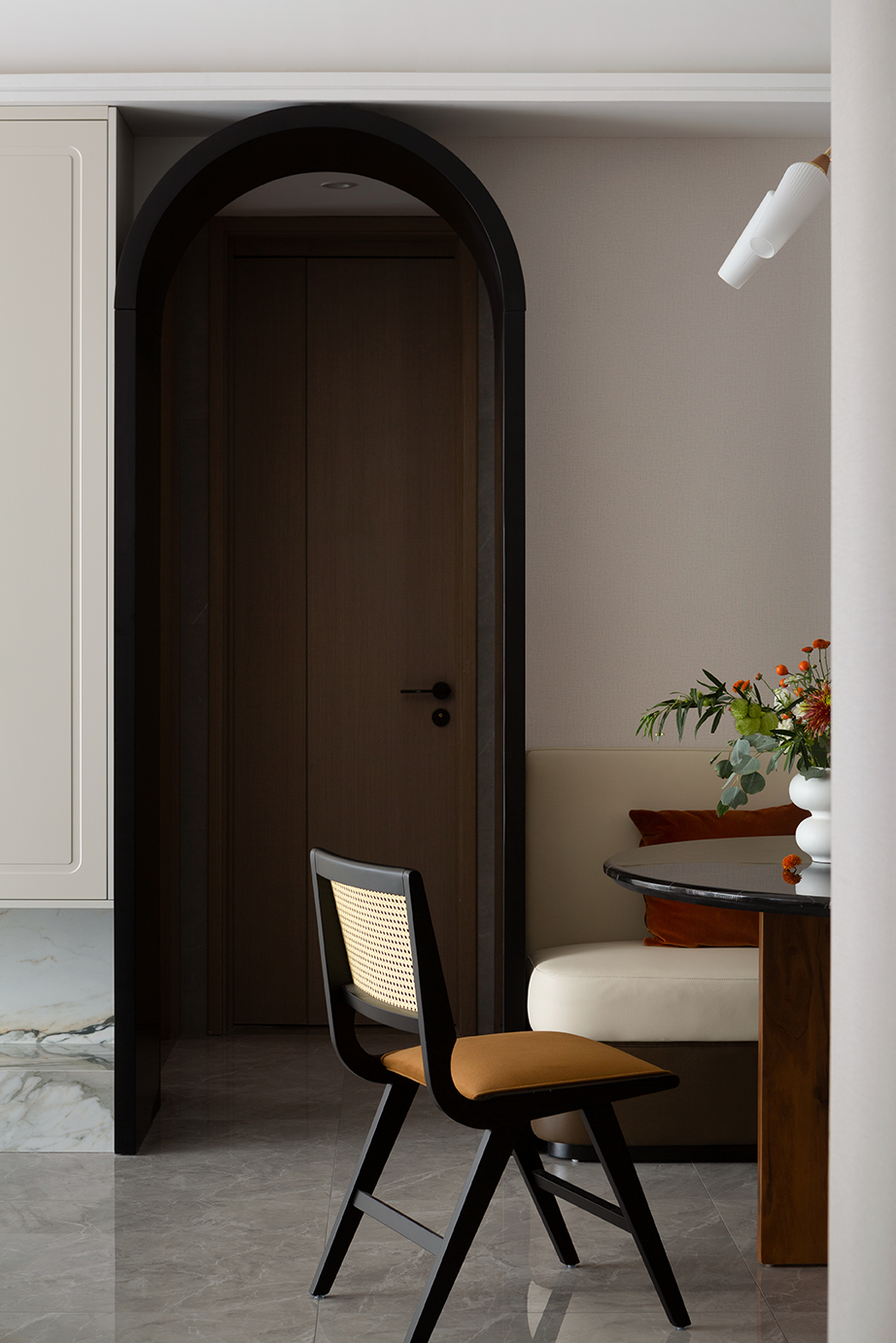 入户即是餐厅区域,简洁利落的弧形门洞是业主赋予空间的专属浪漫,加入卡座设计后的餐厅,让空间在动线上更为流畅舒适。