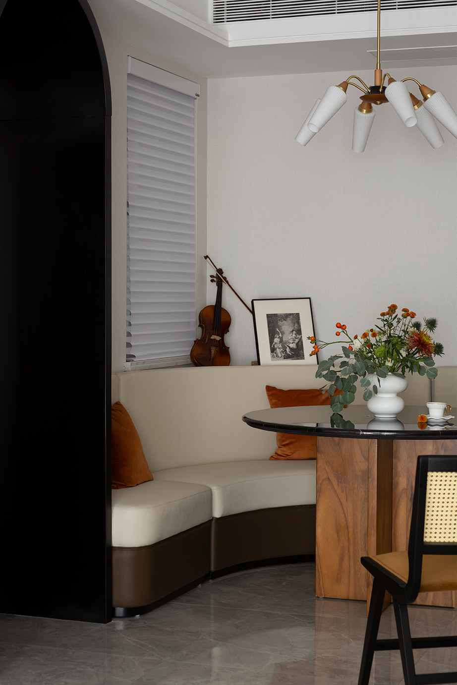 石材餐桌与玉兰玻璃吊灯犹如天生一对,精致又沉稳,放矢间弥漫着法式独有的韵律,连餐椅都是一股扑面而来的优雅。