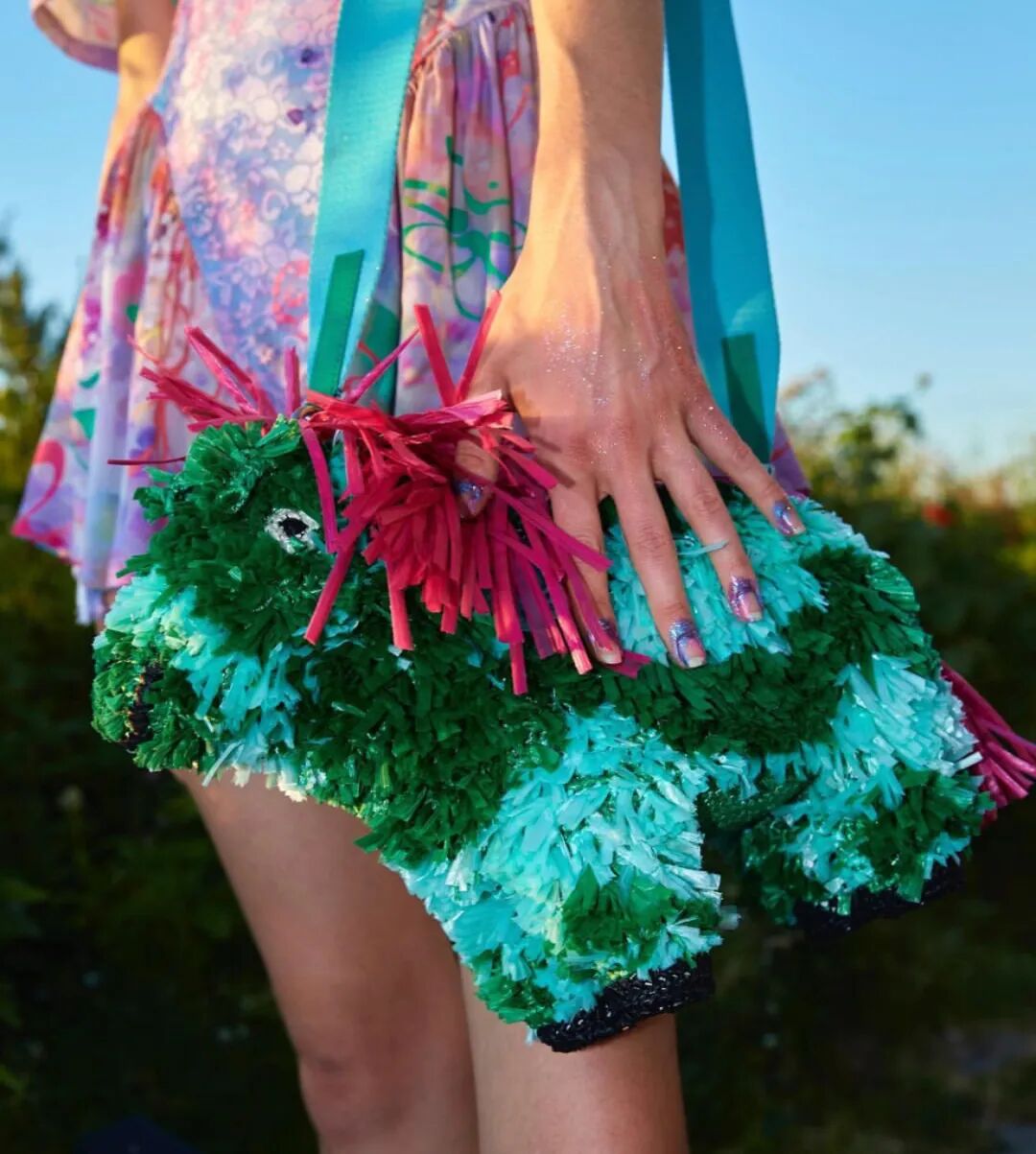 Collina Strada FW 2021 设计师Hillary Taymour大开脑洞,有了将人类变成动物的想法,打造了一出「时尚山海经」,并用可回收面料制作出了既足够夸张大胆又不失实用性的新系列。