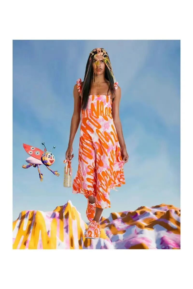 Collina Strada 2022春夏高级成衣“SnailsPace”系列是品牌自疫情爆发以来的第一场Runway秀,所以乐观看待未来的创意总监Hilary Taymor决定以橙黄、桃红为代表的色彩调动观众情绪、调节市场情绪,随后甲虫紧身胸衣、小马驹缎带包和套头卫衣、向日葵编织包、趴在篮里的小狗印花等都为集合增添了不少童趣氛围。