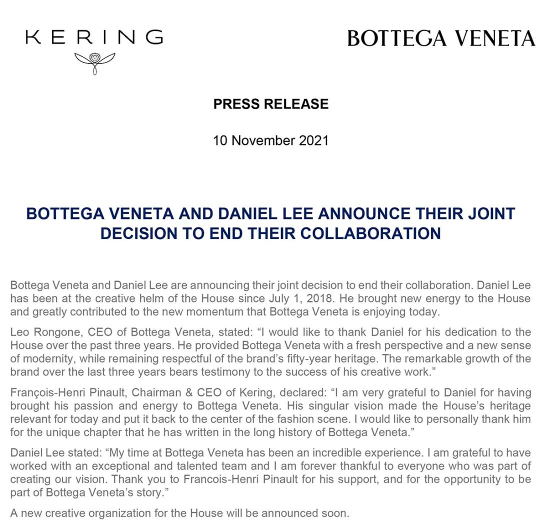 官方声明稿中, Bottega Veneta 与母集团 Kering 写道这是双方共同的决定,并公开称赞 Daniel Lee 为品牌带来的能量与新气象。Bottega Veneta 执行长 Leo Rongone Rongone 表示:「我要感谢 Daniel 过去 3 年多以来对品牌的奉献。