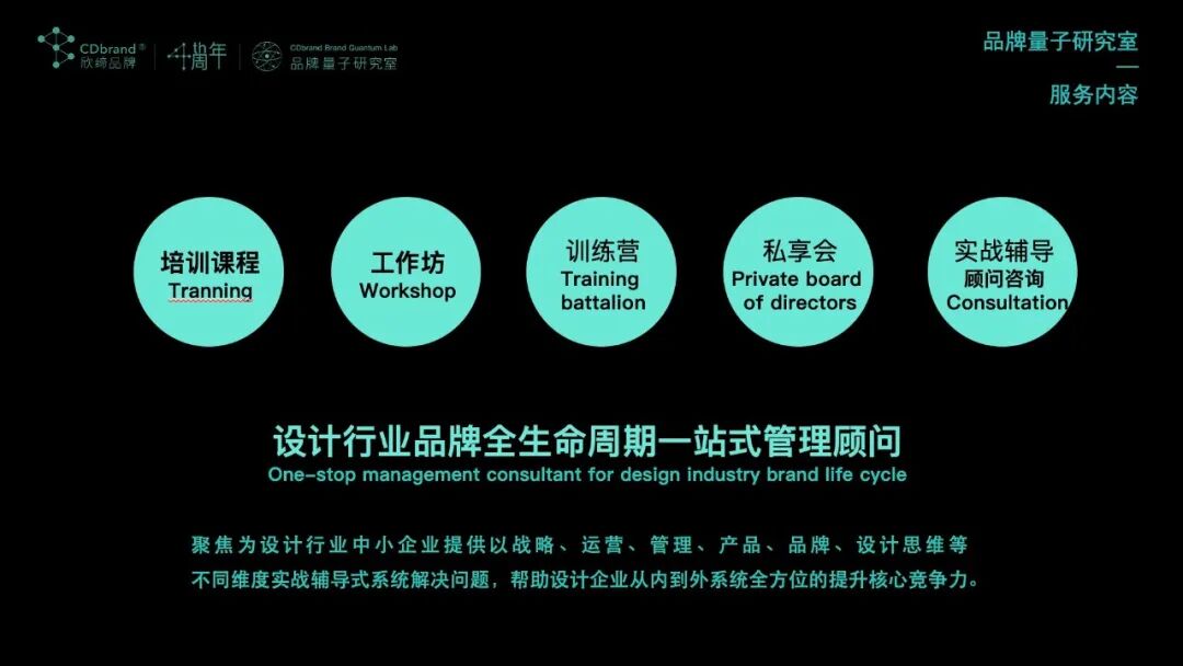 同时,回顾我们在去年品牌量子研究室发布量子模型的基础上,品牌成功的规律:以战略、运营、组织、文化 四大内容为支撑,通过一年时间,研究探索出的具体解决方案和服务内容及方向,资源匹配核心行业专家团队。未来为大家提供系统培训、工作坊、训练营、私享会、实战辅导顾问的一站式多种形式系统解决方案,从内到外的为设计企业量身定制,打造品牌建设2.0版本的企业核心竞争力。同时,宣布公司正式成立《品牌感知交互设计艺术研究室》战略布局元宇宙科技与设计、艺术版块的深度研究和产品开发,为品牌赋能独特价值,为客户创造更多的商业价值。