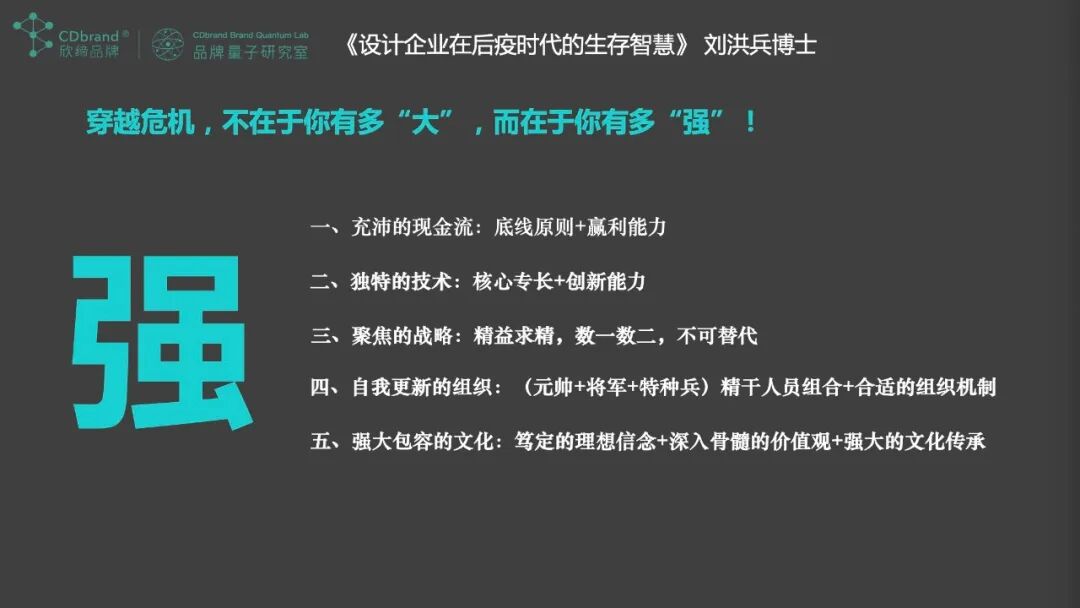 通过对国家政策解读、经济走势、房地产现状解析,以及未来几年发展趋势,围绕后疫时代与危机意识、后疫时代的“变”与“不变”、头部企业的领先之道、 中小型企业的生存智慧几点主要内容,展开讲解如何穿越生命周期,穿越危机,不在于你有多“大”,而在于你有多“强”。同时,举列中小设计企业如何市场聚焦和创新,聚焦市场,聚焦客户、聚焦业务等,实现设计企业智慧生存战略突围。