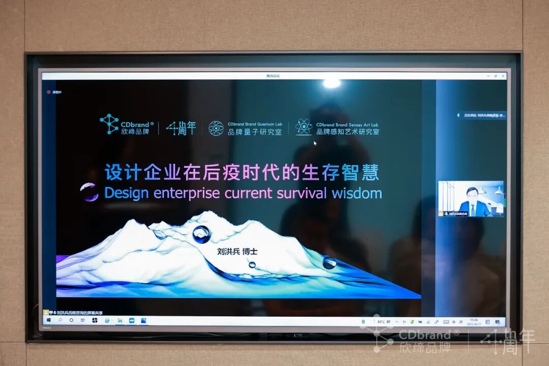 正式进入主题分享环节,首先,第一位嘉宾是欣缔品牌量子研究室,联合发起人首席战略顾问-刘洪兵老师为大家分享《设计企业在后疫时代的生存智慧》,由于4月25号北京疫情突出性形势严重,离京管控受限,未能亲临现场面对面为大家分享,刘老师用线上直播的形式为大家分享。