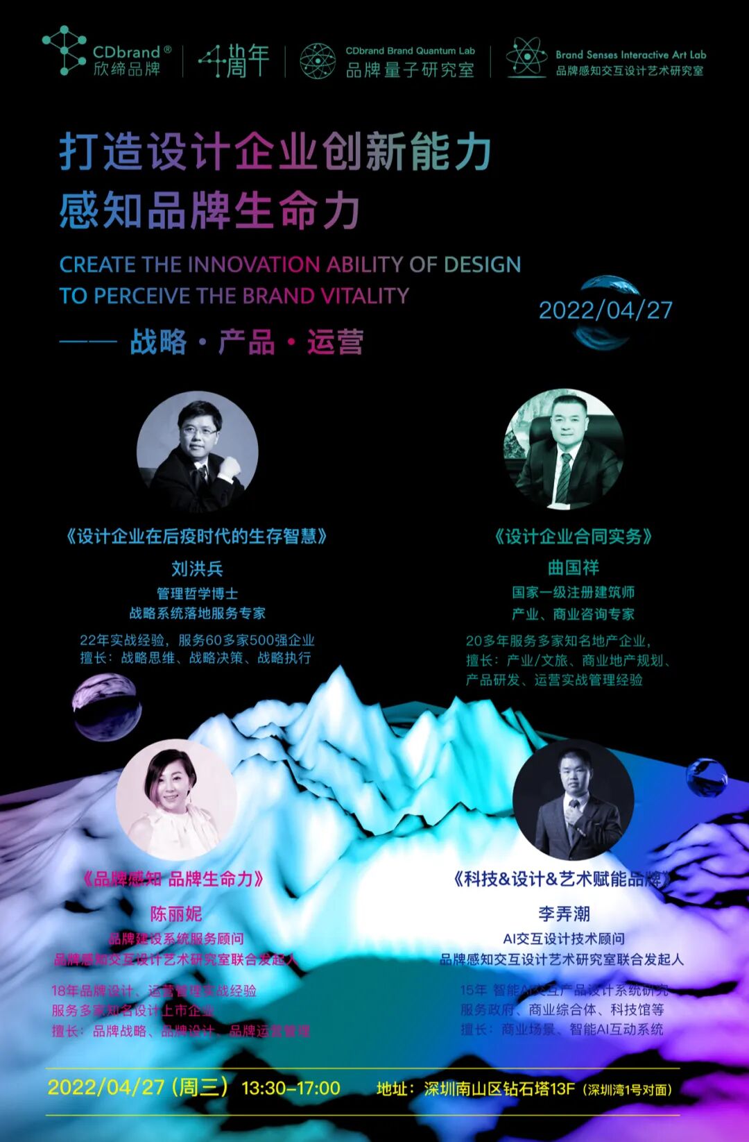2022年4月27日,CDbrand欣缔品牌4周年《打造设计企业创新能力,感知品牌生命力》暨《品牌感知交互设计艺术研究室》发布仪式圆满举办。出席本次活动嘉宾有深圳市室内设计师协会领导科技、建筑、景观、文旅、室内、灯光不同专业领域的设计师、商业精英跨界嘉宾们,新老朋友大家欢聚一堂,共同见证了欣缔品牌四年的成长。聆听了四位嘉宾干货精彩分享,分别从战略、运营管理、品牌感知、品牌生命力及元宇宙技术 AI智能艺术多个维度,解析在后疫时代,企业发展重点关注和快速提升企业核心竞争力的策略和建议,希望对企业在突围和创新有所启发和帮助,探索设计企业未来更多可能性。