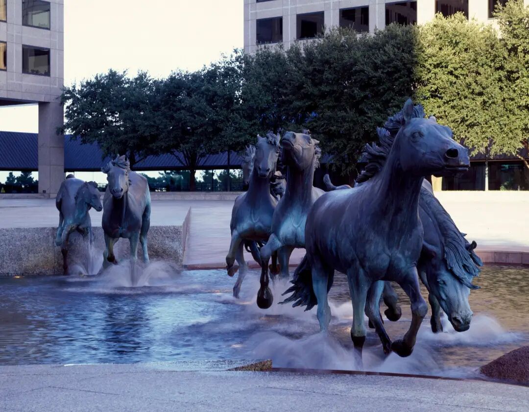 拉斯科琳娜的野马是罗伯特·格伦的青铜雕塑,装饰德克萨斯州欧文拉斯科琳娜的威廉姆斯广场,它描绘了九只野马穿过一条水道的场景,它们的大小是真人大小的1.5倍,喷泉给人一种动物蹄子溅水的效果。作品于1976年投入使用,并于1984年安装。