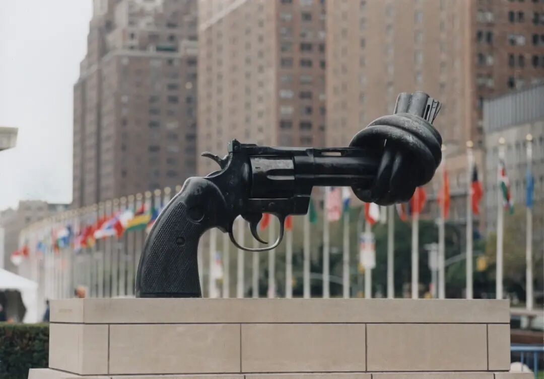 Carl Fredrik Reuterswärd的《非暴力》也称为打结的枪,恰如其分地位于纽约联合国旁边。这座雕塑代表了对非暴力未来的希望,这件由卢森堡委托为联合国赠送的礼物是武器到艺术运动背后的灵感之一。