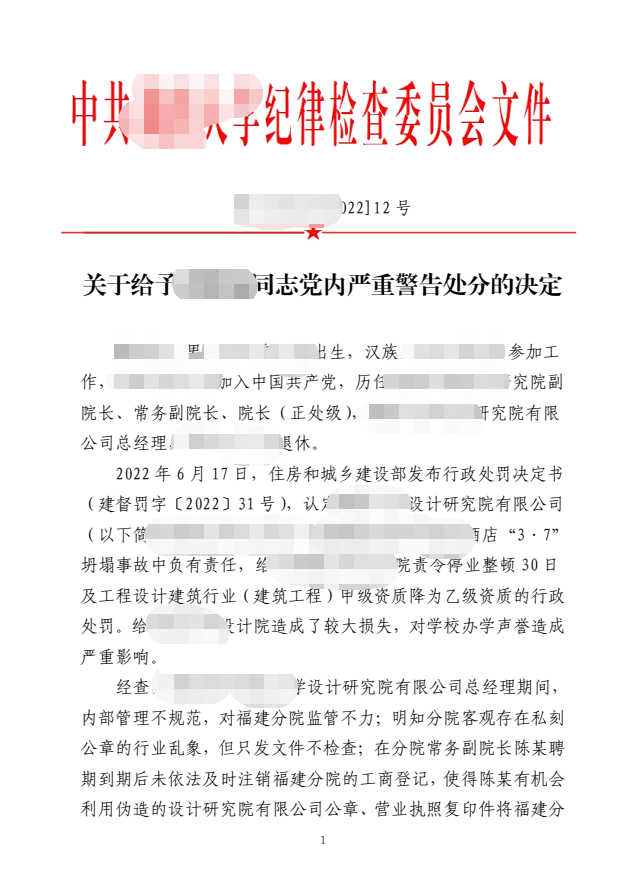 近日,某知名大学设计院前院长(已退休),因去年3·7坍塌事故被学院党委给予党内严重警告。原领导班子成员被问责。