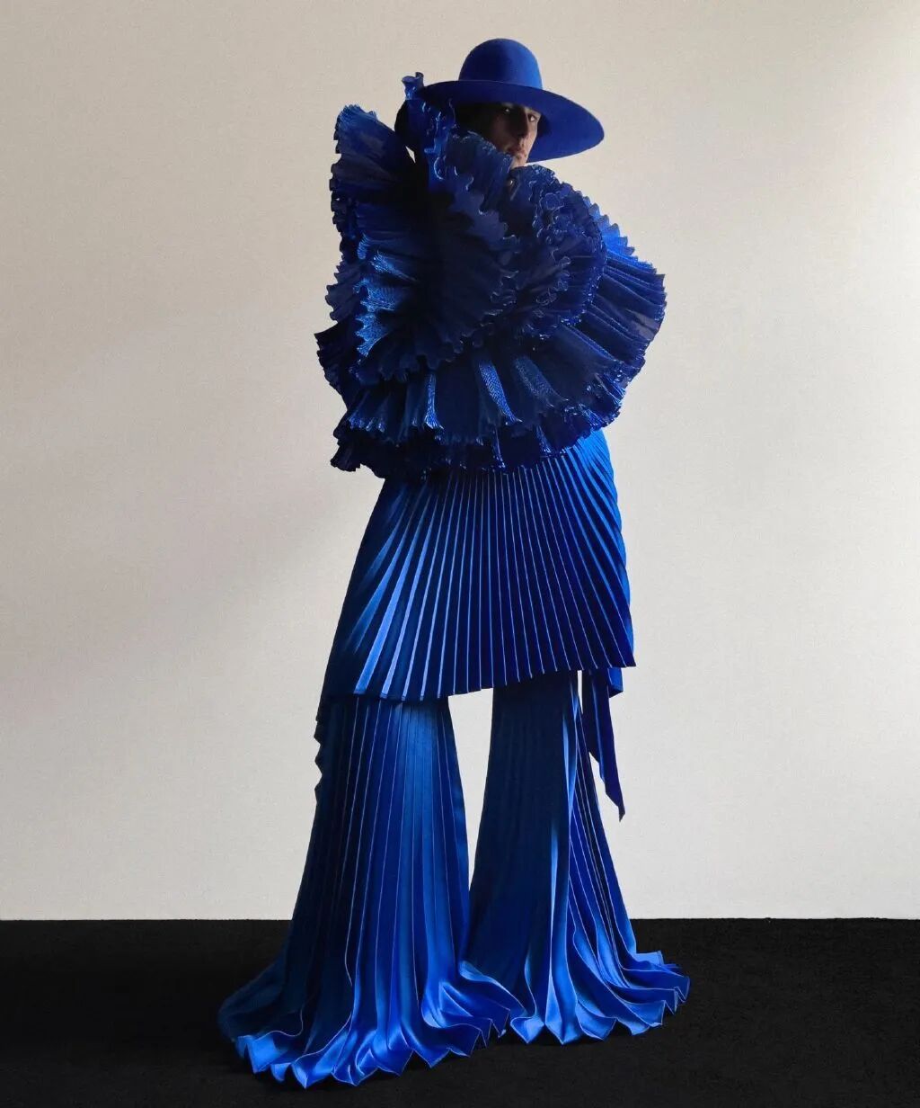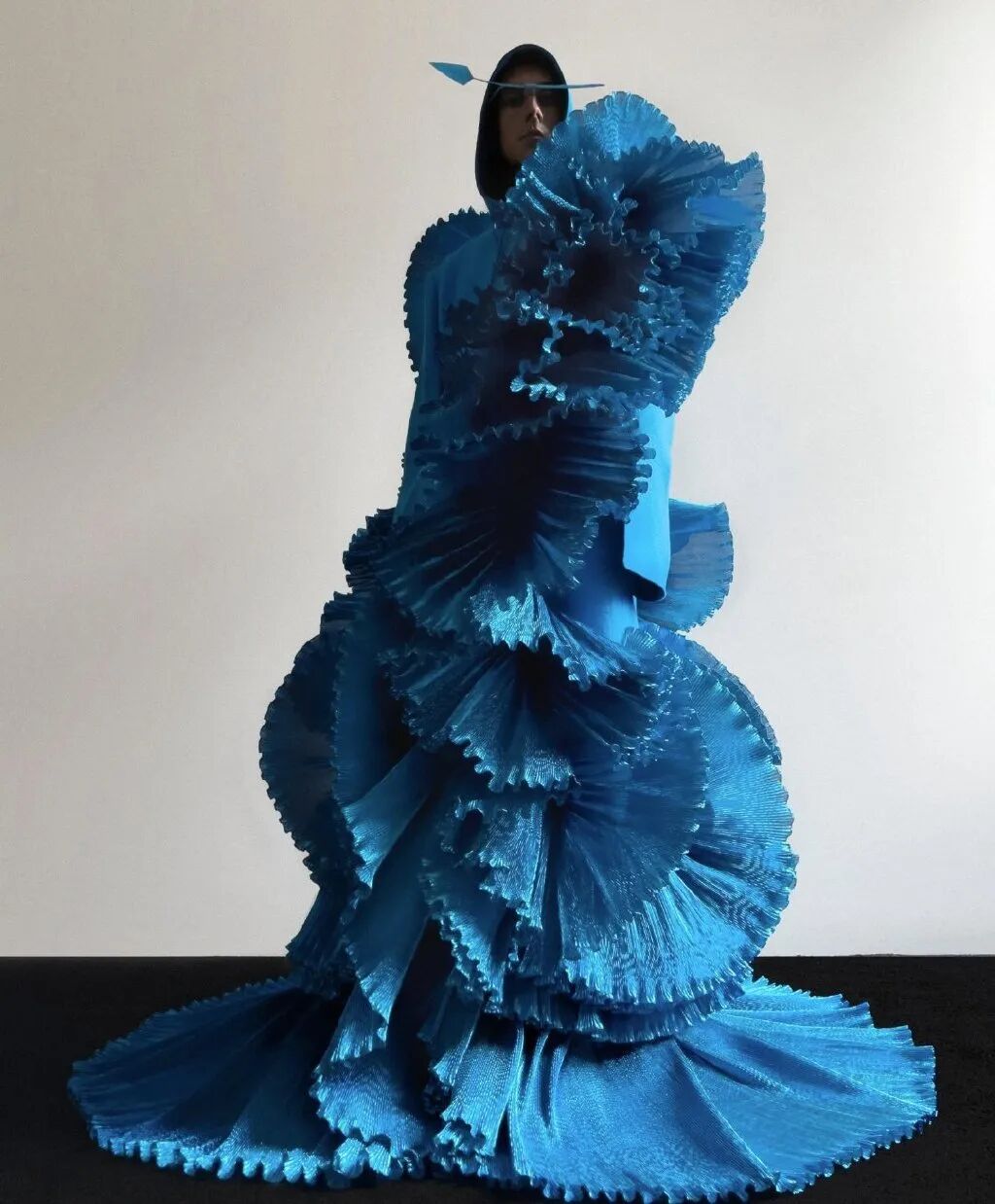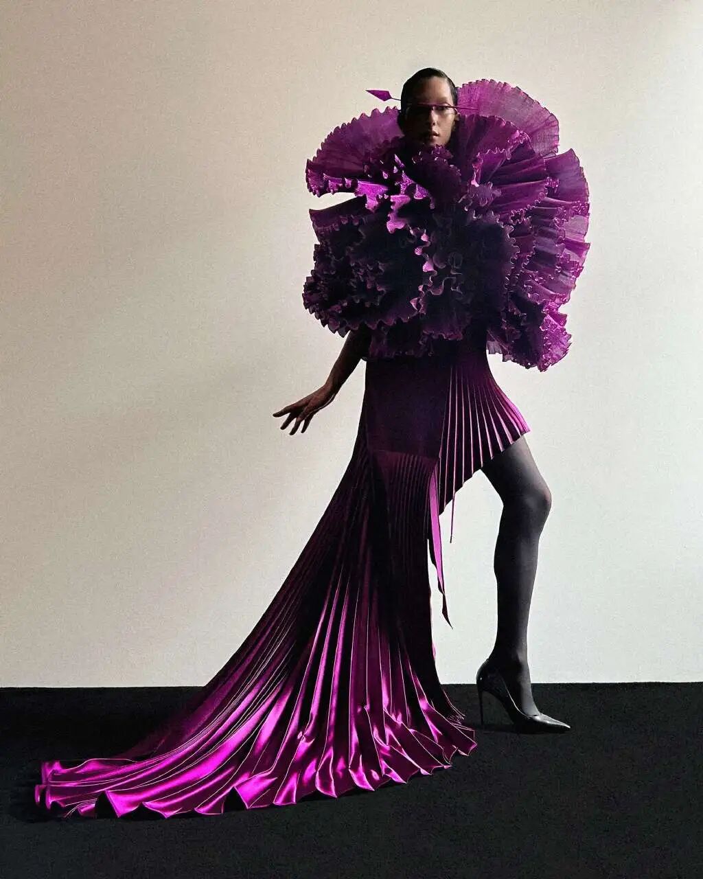 他追求创意剪裁、繁复的结构工艺、高级的材质质感——采用化纤玻璃纱以及天然面料来纯手工缝制褶边,数码印花与手工染色研发面料的方式并行不悖,色彩因而更为和谐共生。