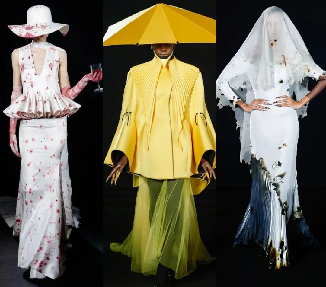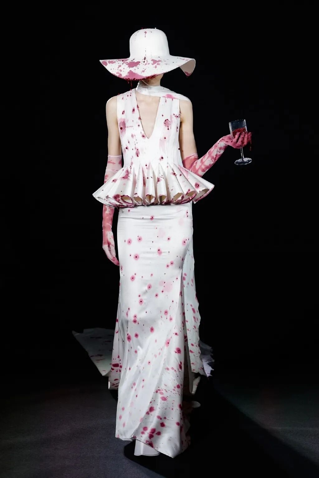 Robert Wun 2023春夏高级定制,以“恐惧”为主题,那些意外如红酒污渍、布料被灼伤以及锋利的刀刃。夸张的廓形以及羽毛呈现优雅却又危险的气息,创意十足,堪称惊艳。
