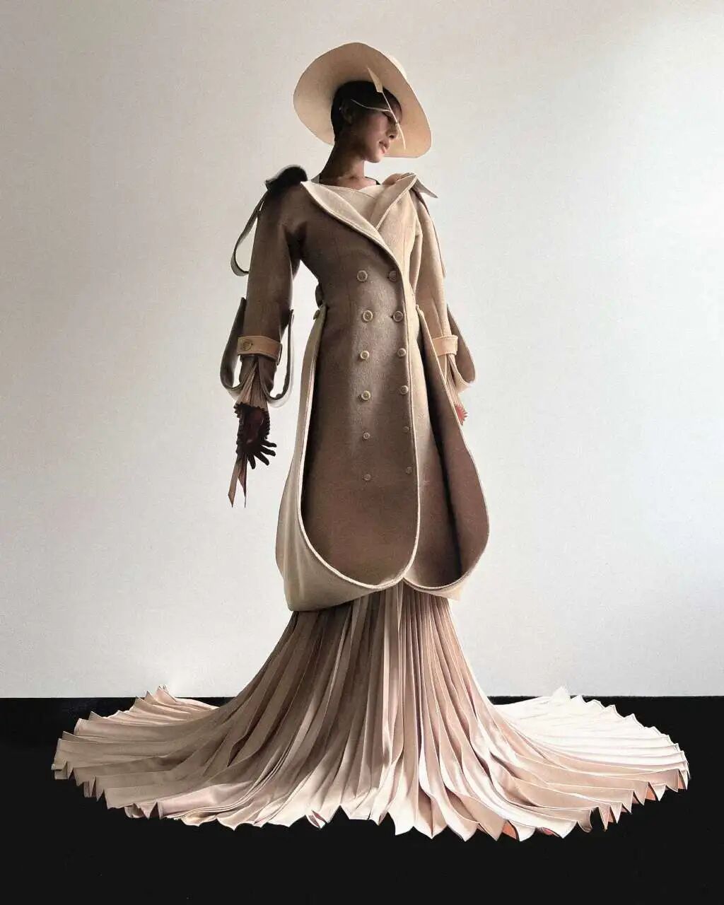 带有雕塑立体感的波浪层次和褶皱堆叠的应用,令人印象深刻的面料材质对比,这些具有强烈个人风格印记。无不凸显了其强烈的视觉冲击力,在产生对人与自然的思考同时,赋予了设计师真实的情感流露。