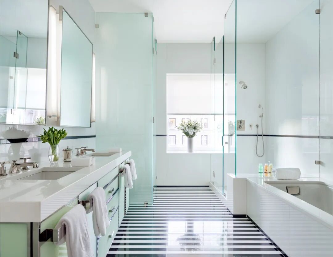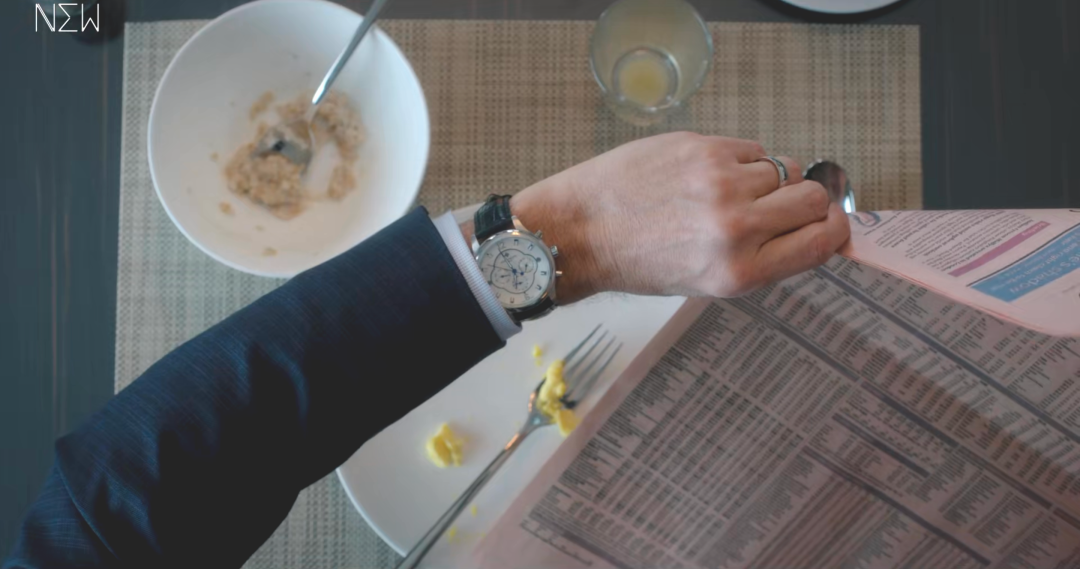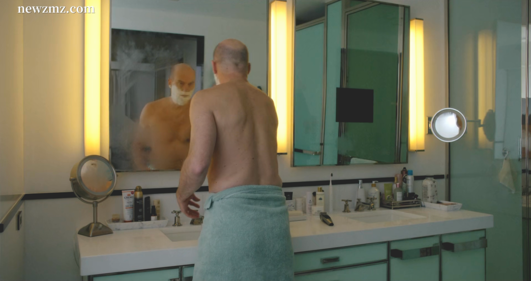 其实从看到那间睡房开始,我就根据其风格和窗框基本确定了拍摄地在The Mark,等他再进浴室,斑马纹地面和湖绿色烤漆玻璃柜面让我完全锁定The Mark。待他穿过几道门抵达早餐厅,我确定了剧组取景的户型是占据了酒店顶层和塔尖的Penthouse。