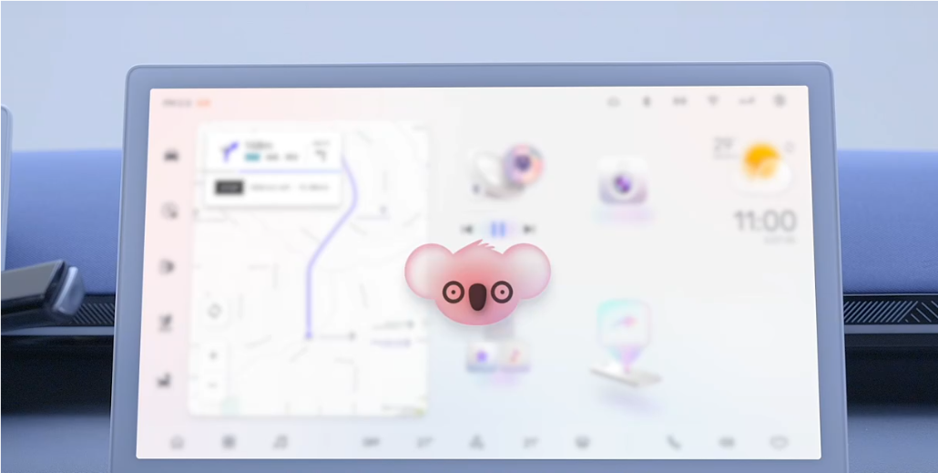 车辆启动后,AI助手就随时等待差遣。考拉这台卡车的AI形象就是一只可爱的小考拉,没唤醒的时候就是睡眠状态,唤醒后可以表现出聆听、惊讶、执行、提醒等多种状态。它支持四音区语音识别,多轮连续对话,可见即可说。