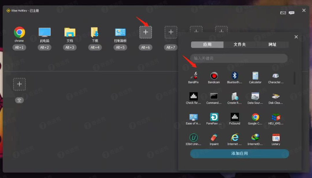 除了 Windows 的系统应用,还能为自己安装的应用程序设置快捷键,点击软件界面的「+」,选择需要创建快捷键的程序图标即可,然后直接按组合键设置快捷键就可以了。