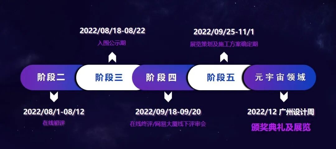 本次设计大赛共设“源引力·应用组”、“元宇宙·未来组”2大赛道,分别在项目策划及定位、设计创新和视觉美学性、功能应用上有不同的评分标准。赛事流程如下。