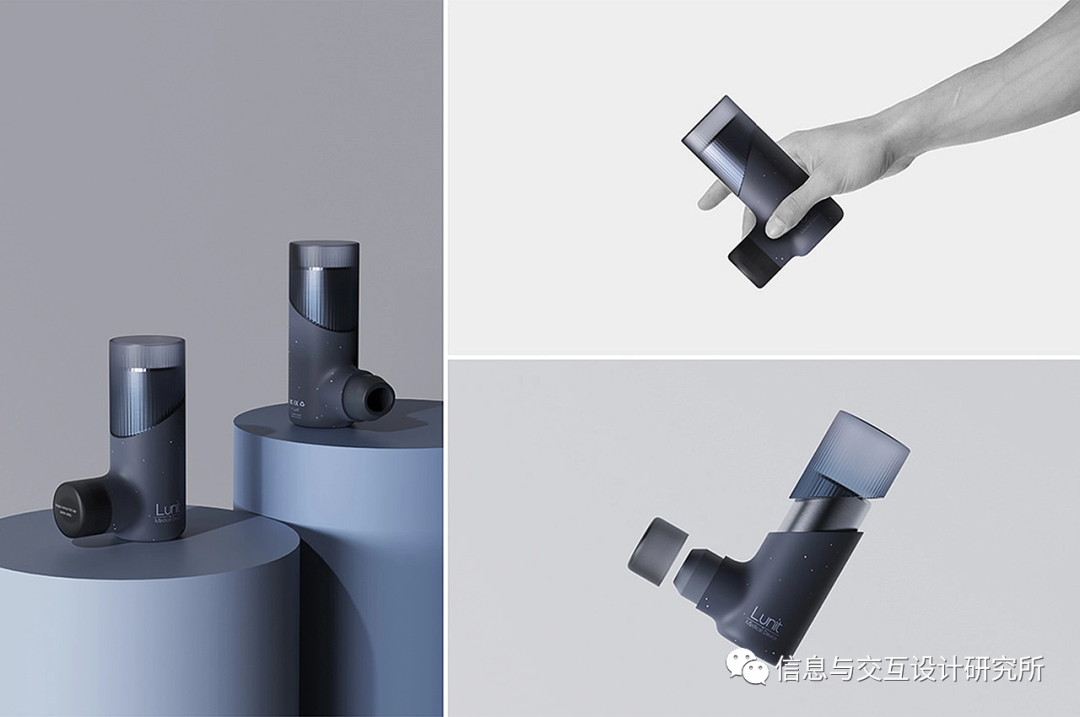 Lunit 由四种医疗设备组成:吸入器、血糖仪、胰岛素注射器和血压血氧仪。Jang 和 Park 选择了便携式医疗设备,因为他们注意到当今市场上仍然存在的陈旧医疗设备缺乏人体工程学和舒适性。Lunit 的每个装置都以月亮的阴暗面为灵感,乍一看并不显眼,以烟熏黑色和灰色调装饰,并包裹着让人联想到晚雾的半透明覆盖物。