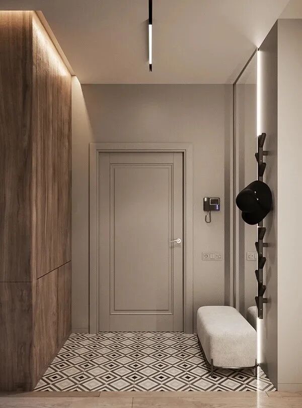 照明设计:普通照明(筒灯或吸顶灯)+重点照明(挂衣区+射灯,台面/底部换鞋区+灯带,柜体内部+灯带)+装饰照明(灯带、射灯等),可以均采用对应形式的感应灯。