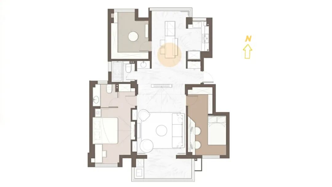 照明设计:基础照明(筒灯或吸顶灯)+重点照明(餐桌区域+吊灯或轨道灯、厨房料理区+灯带或射灯、柜体内部+灯带)+装饰照明(灯带等),其中柜体内部采用感应灯。