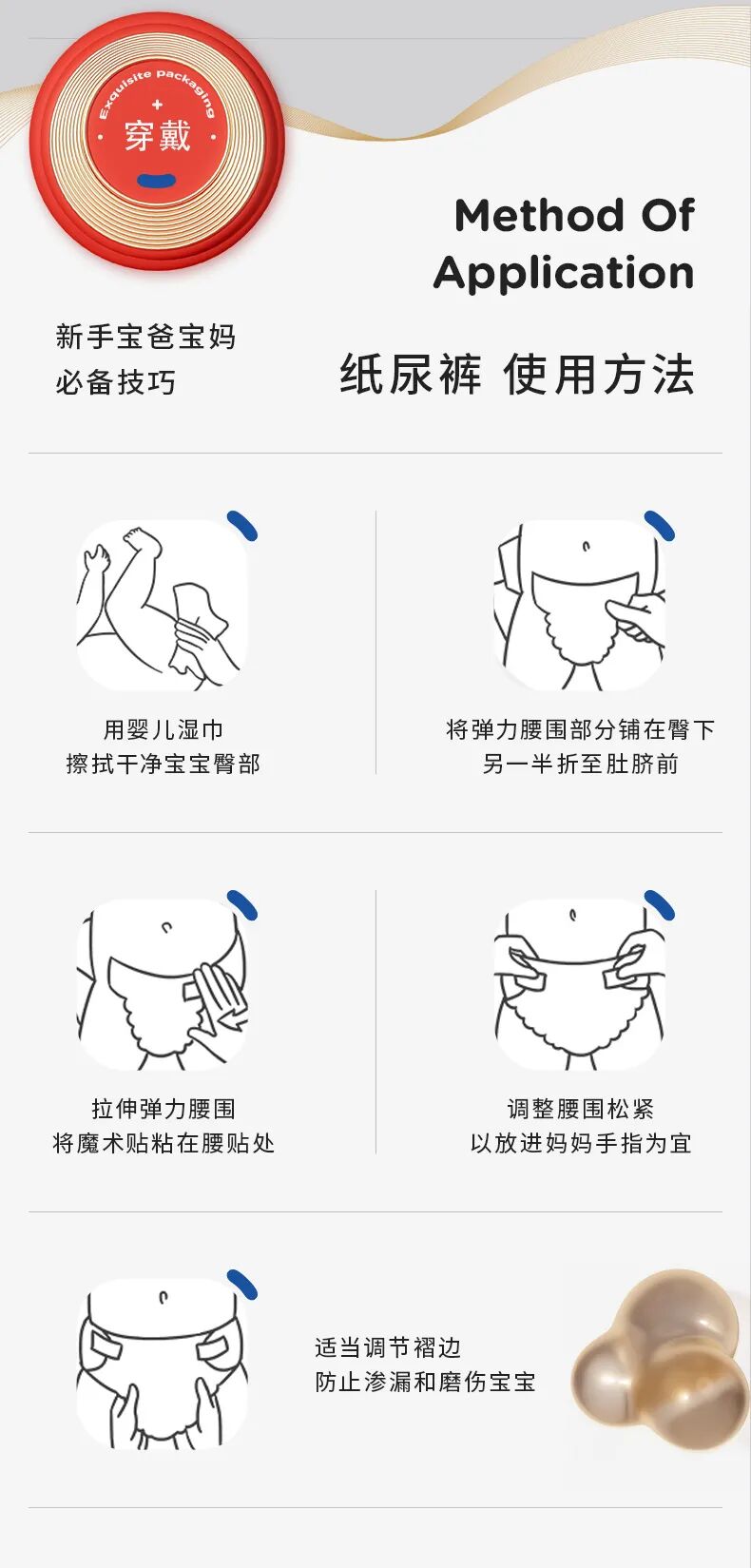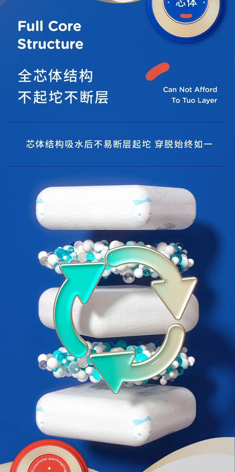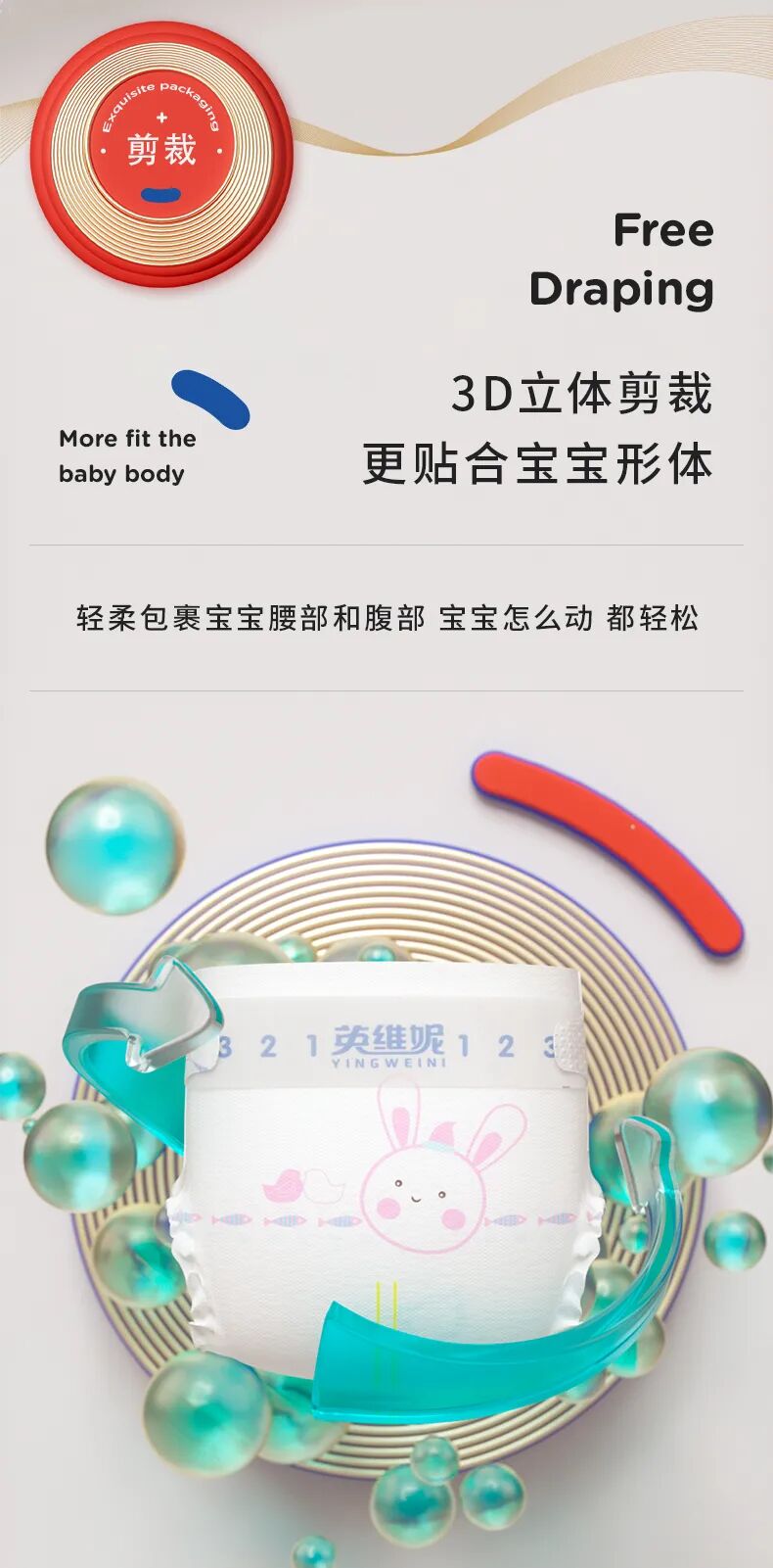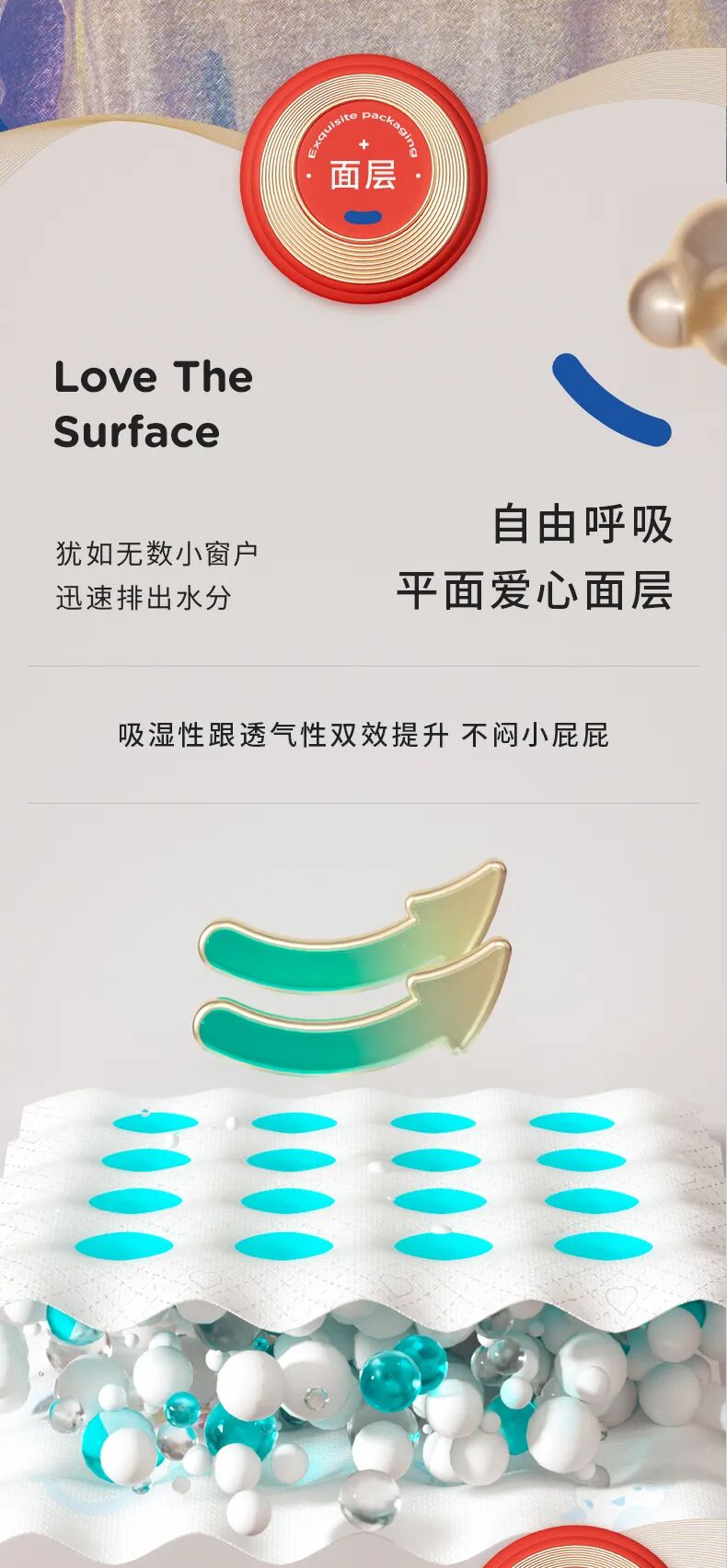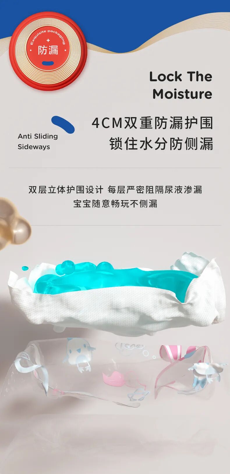 这款纸尿裤设计的很不错,里面运用了大量的立体图标元素,着重表现了产品的不同卖点。