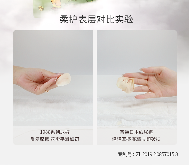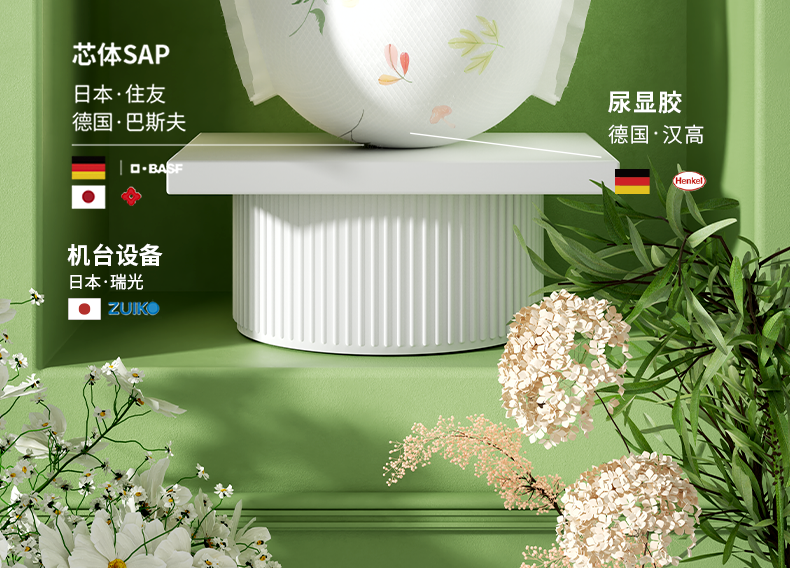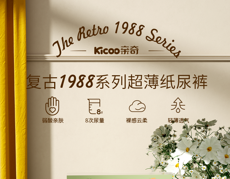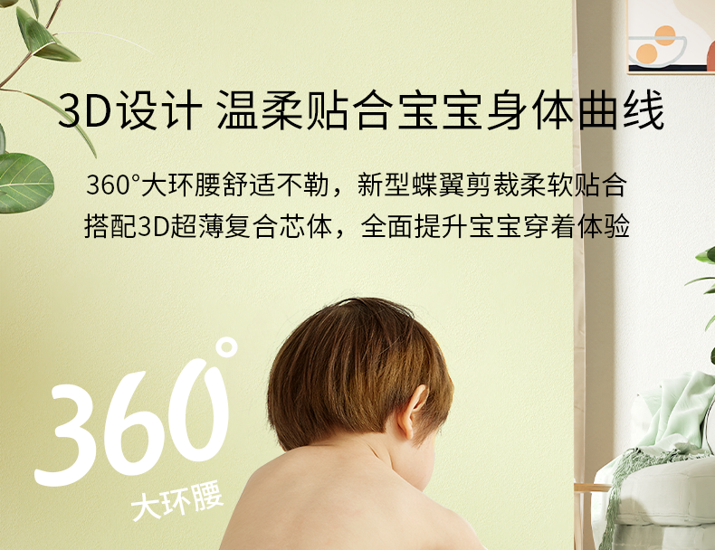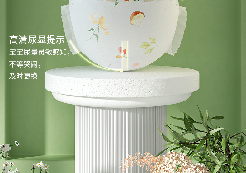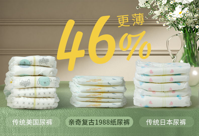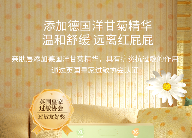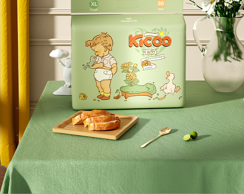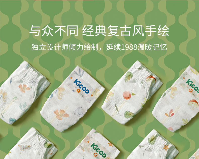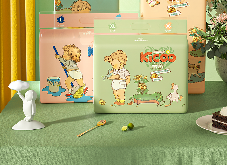 这款纸尿裤从包装和名字,就可以看出定位于复古。色调绿色和黄色的搭配看起来非常轻柔。很适合母婴类产品。