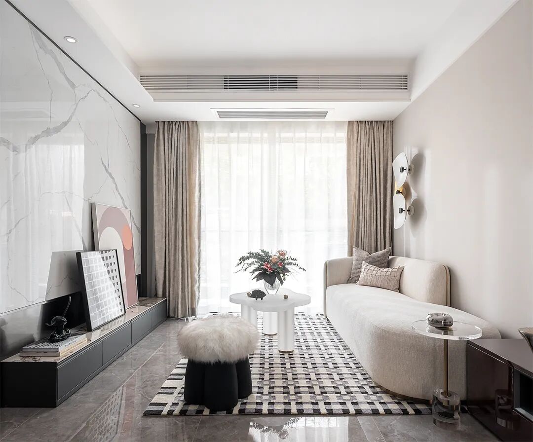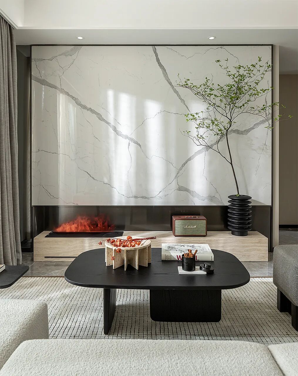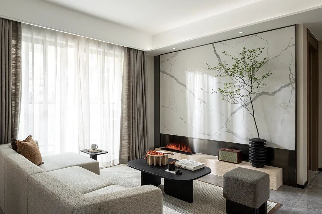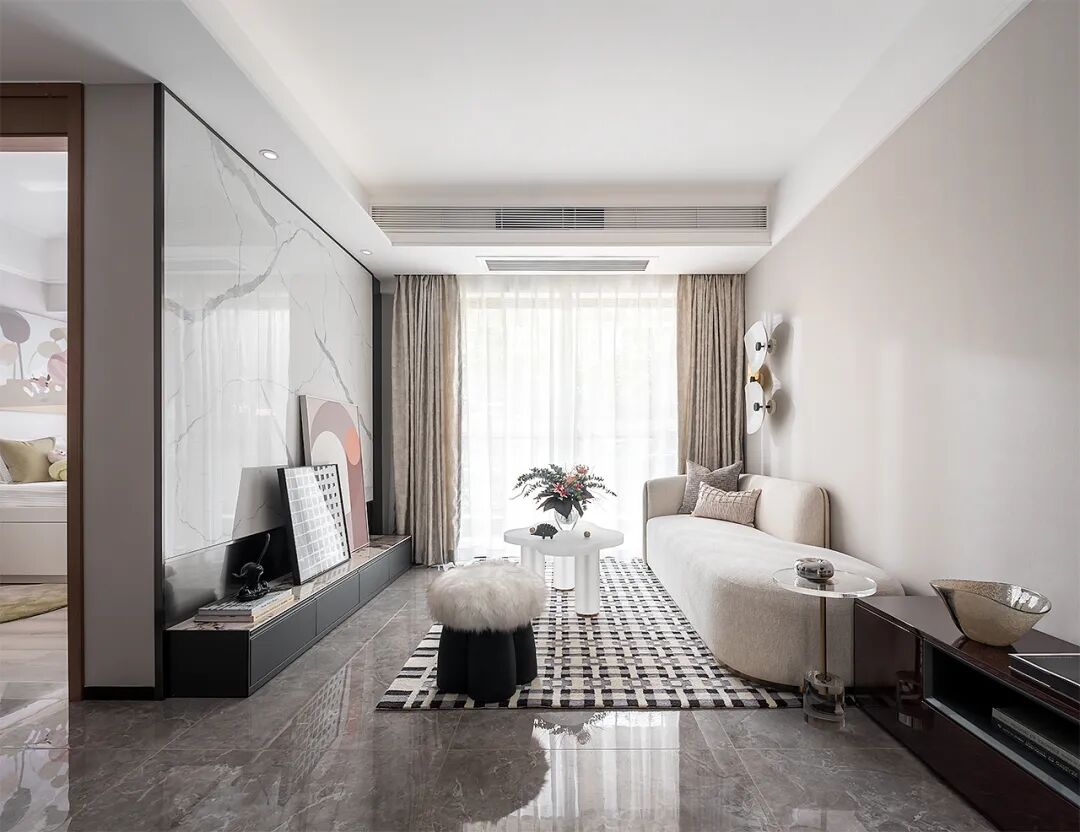 空间内大理石纹理的背景墙,搭配浅杏色的质朴沙发,简洁的电视柜轻盈而素美,剥离了不必要的外在修饰,去除杂质、保留本真,呈现了一种最独特的美感,重返生活本质。