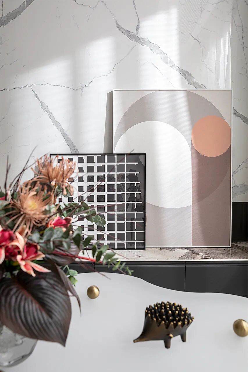 黑白灰格纹与唯美的花艺氤氲着浪漫的因子,也正洋溢着诗意的情愫,并将温柔而独特的记忆永远的留存于客厅内——时间之外,内心之中。