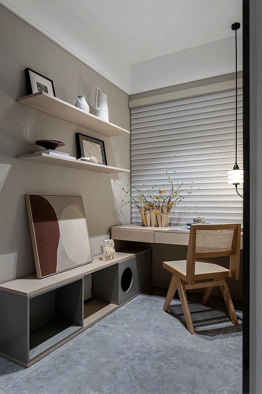主人公隐逸日常的陶艺之美的同时,也给猫咪预留专属天地,在工作闲暇时治愈疲惫的心灵。考虑到猫咪的动线,在层板之间留有些许缝隙,特地设置了爬行通道“猫洞”,使猫咪拥有更多的弹性移动空间。