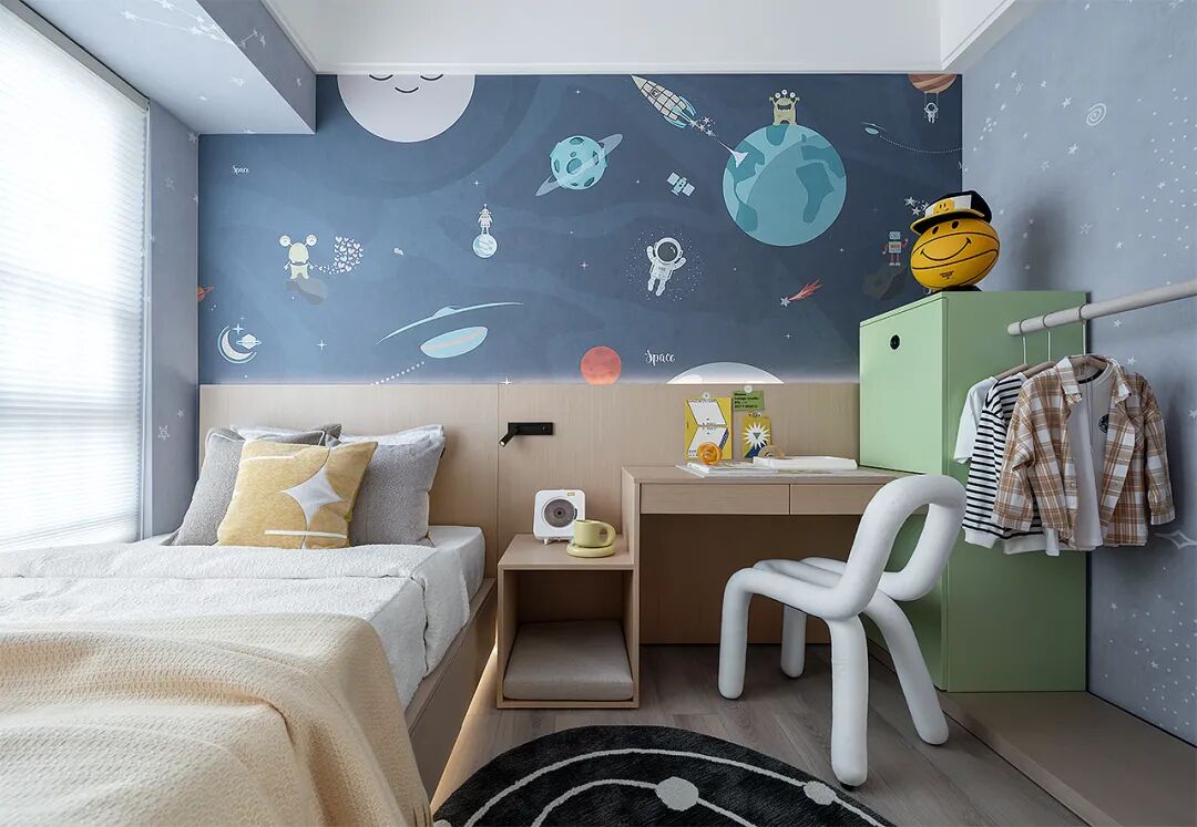 这是一个从小萌芽的航天梦,激昂主题呼应床品及艺术摆件,让整个空间酷炫不失趣味性,湛蓝神秘广阔,象征着青春激昂少年的人生,从此刻变得耀眼。