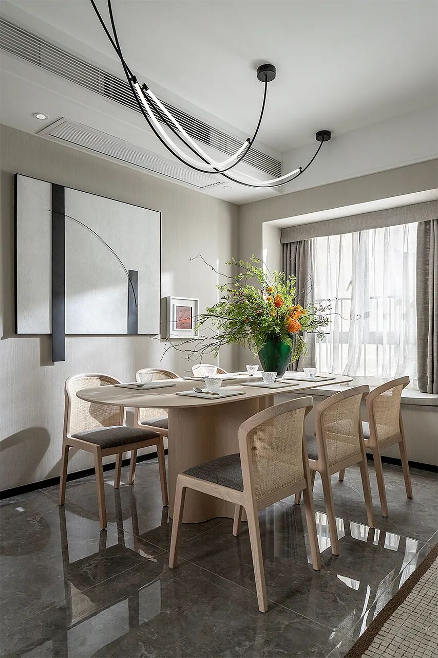 绿枝摇曳,米灰色的餐椅,与墙上渐变的装饰画相得映彰,赋予空间以感性与浪漫的生命力。早晨明媚的阳光穿过窗台,洒满空间,主人公在此品味那清欢与平淡的时光。