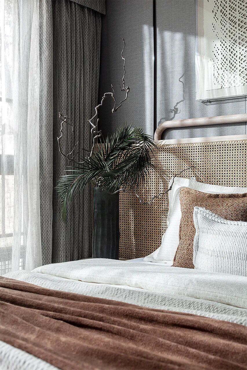 次卧内自然质感与侘寂美学的集合在温暖的原木色天然材料和木质墙板,肆意生长的绿植和触觉装饰材料的使用中得到了体现,更加凸显一份的厚重底蕴和安静质朴之美。