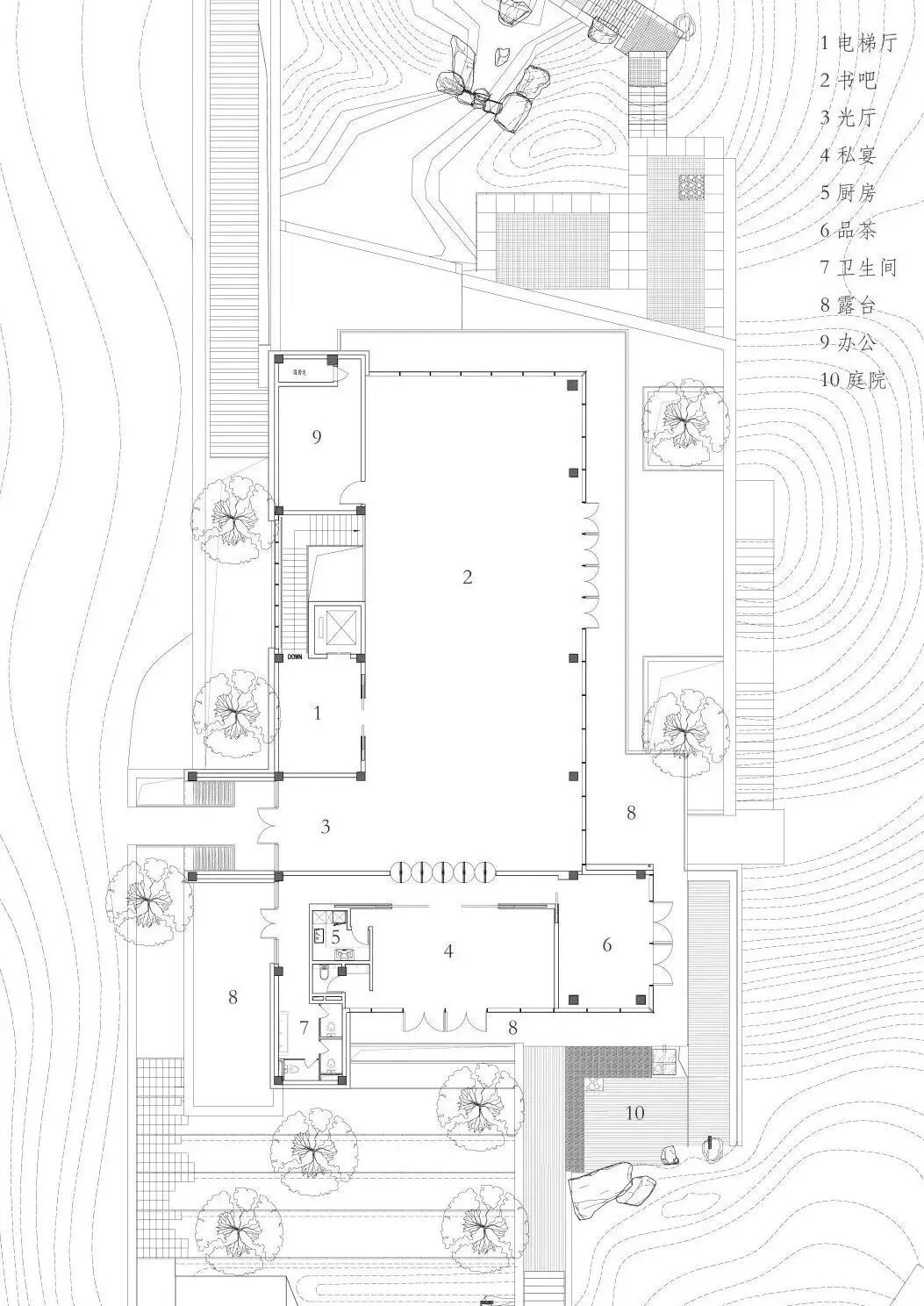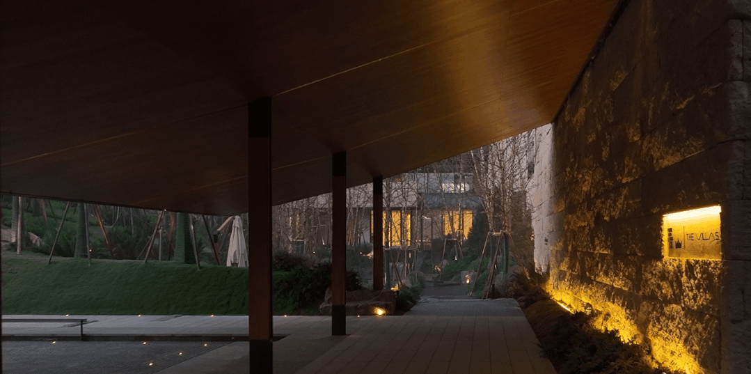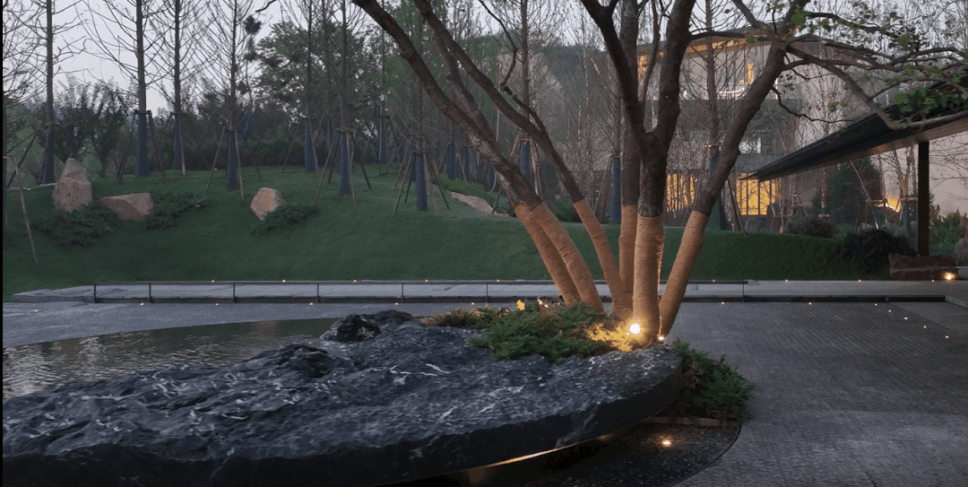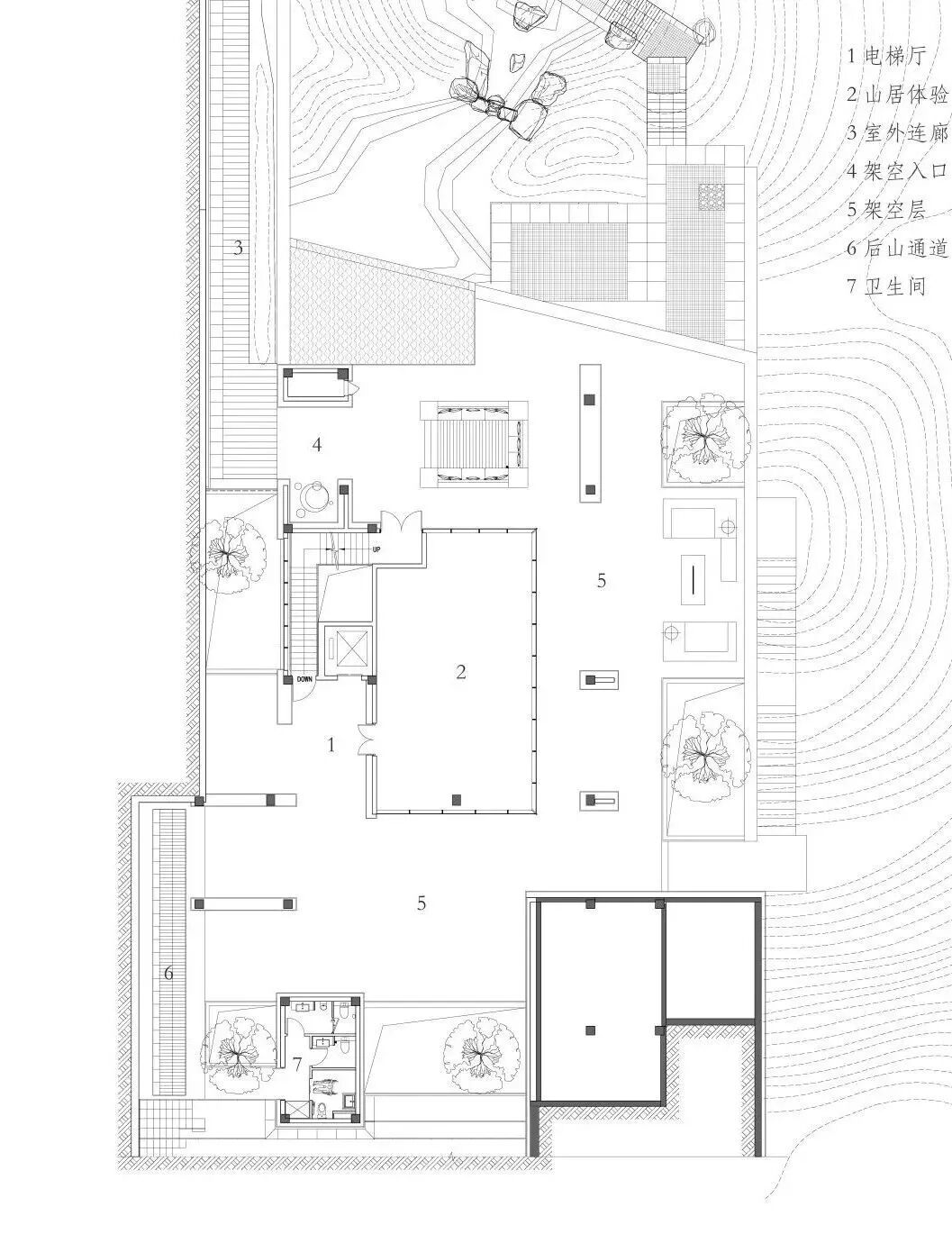 万科吾山1600平方米的美学馆,位于徐州市五山公园板块。周边青山环绕,绿林成簇,有宜居的良好基础。踏勘现场,设计师发现场地南高北低,地势复杂,高差12米处有石灰窑,高差30米处有梅花坞公园景观亭,如何自然处理高差、借景山林成为吾山破题关键。设计师非常智慧地把有高差的场地处理成低处落客入户,坡段营造溪流景观结合美学馆的自然分区,上坡叠水拾级而上的小景和建筑的层层挑台对话,建筑和景观不再有清晰的边界,融入了层层叠水的意境。很自然成为居民们喧嚣后归于宁静的“后山”。这样的分区即保留人们对这个坡地的记忆,又强化处山居高差体验,顺山势造景延申体验空间序列,自然的音容从建筑的每一个角落渗透进来,而建筑又好像是从自然地貌滋生出来的,形成戏剧化的奇妙体验。