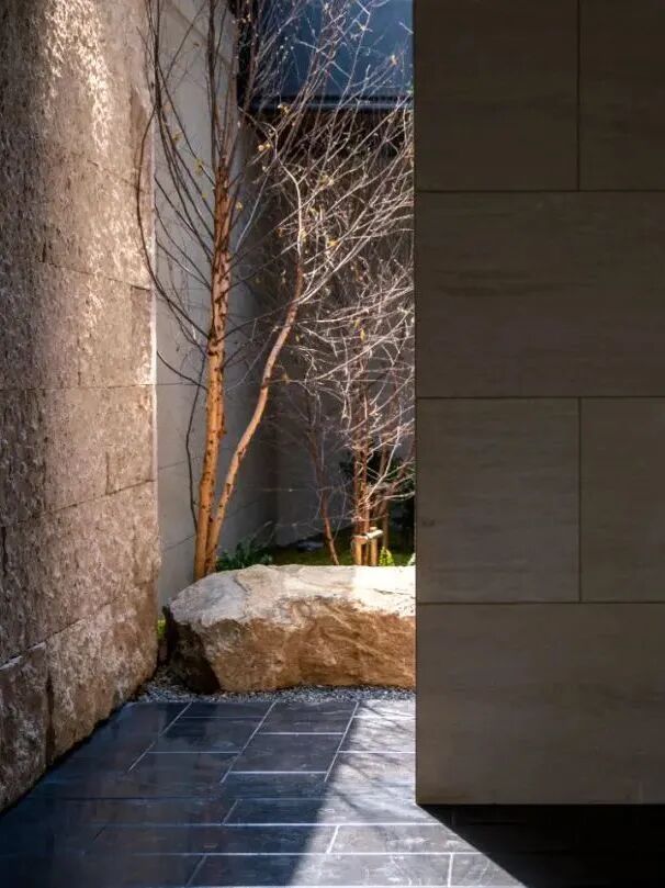 在这里,流动的石料片墙,出挑的木屋檐,与纵向景观高湖石砌成的厚墙穿插交错,宛如蒙德里安高度抽象的绘画作品,在复杂微妙的变化中达到一种诗意的视觉平衡。
