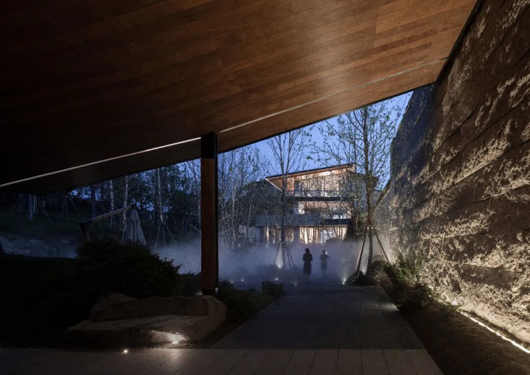 仿佛山体延伸的一部分,建筑空间靠着几层平台而生长在场地之上,两层巨大的平台和叠水结合,一层平台向左右延伸,二层平台向前方挑出,几片高耸的片石墙交错着插在平台之间,力量感暗示出美学馆的核心空间。溪水由平台怡然流出,建筑与溪水、山石、树木自然地结合在一起,像是由地下生长出来似的。
