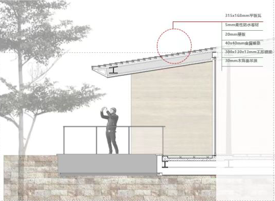 建筑屋顶由两片倾斜出挑的屋面构成、不规则的倾角和倾线,这是对该地区山峦起伏典型地貌的几何学诠释。建筑外形强调切片式块体组合,使建筑带有明显的雕塑感。
