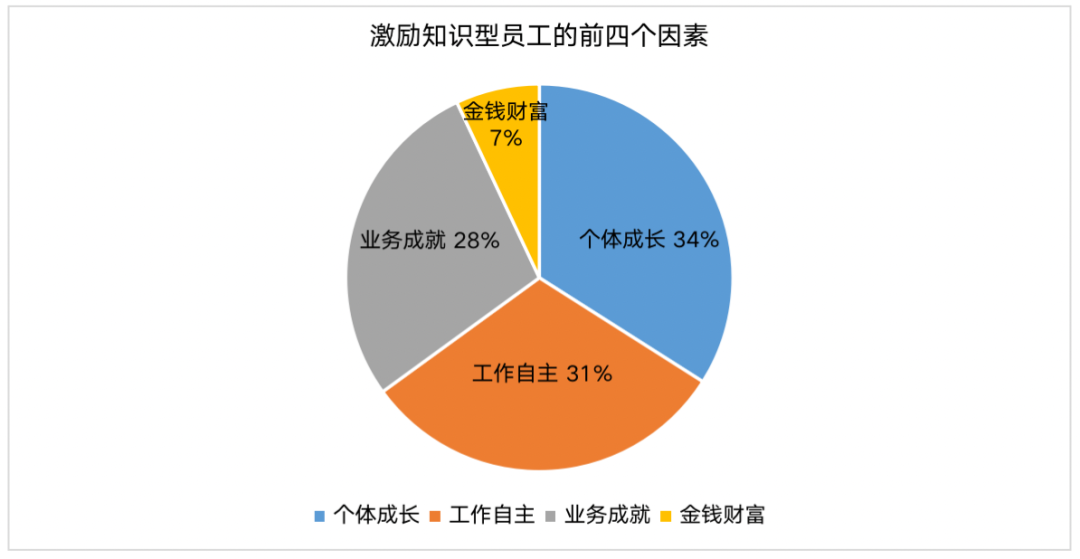 那么,我们该如何长期留住、用好知识型员工呢?知识管理专家玛汉·坦姆仆经过大量研究后认为,激励知识型员工的前四个因素分别是:个体成长(约占34%)、工作自主(约占31%)、业务成就(约占28%)、金钱财富(约占7%)。从玛汉·坦姆仆的研究成果看,对知识型员工的激励,不能以金钱刺激为主,而应以其发展、成就和成长为主,但同时也不能忽视金钱财富的作用。