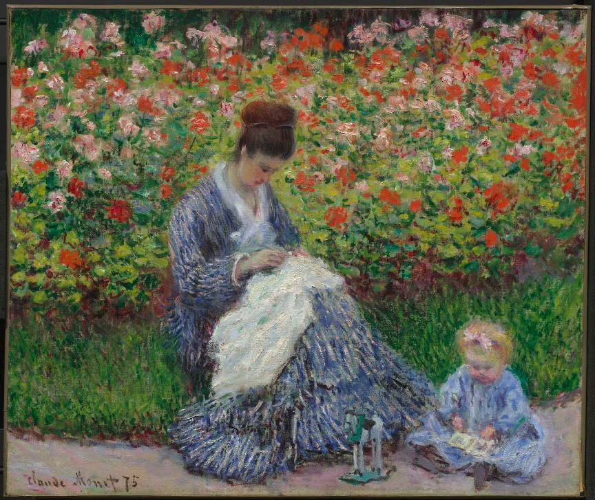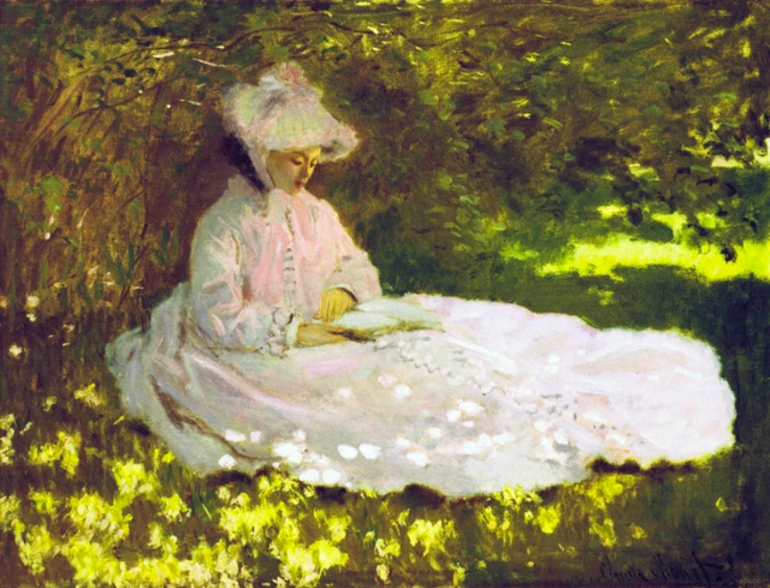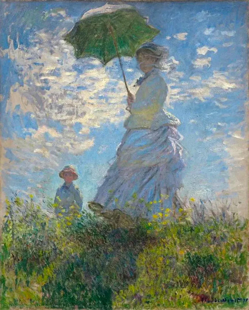 莫奈笔下的卡米尔,手持阳伞,逆光而立。阳光透过湛蓝的天空洒在她身上,衣裙夹着金黄、淡蓝、浅粉的闪光在风中飘荡。蓦然回首,双眸盈盈,饱含深情。