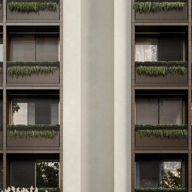 整个建筑呈左右对称型设计,塑造出一个简约、时尚又富有雕塑感外观,阳台处再应用绿植进行点缀,透出一抹清新、自然的韵味,使建筑与周围环境更加和谐。