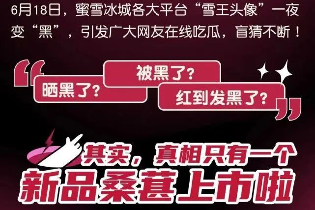 之后,品牌官宣称雪王因为去葚园采摘桑葚而被“晒黑”,借势话题开辟出一条新品营销之路。