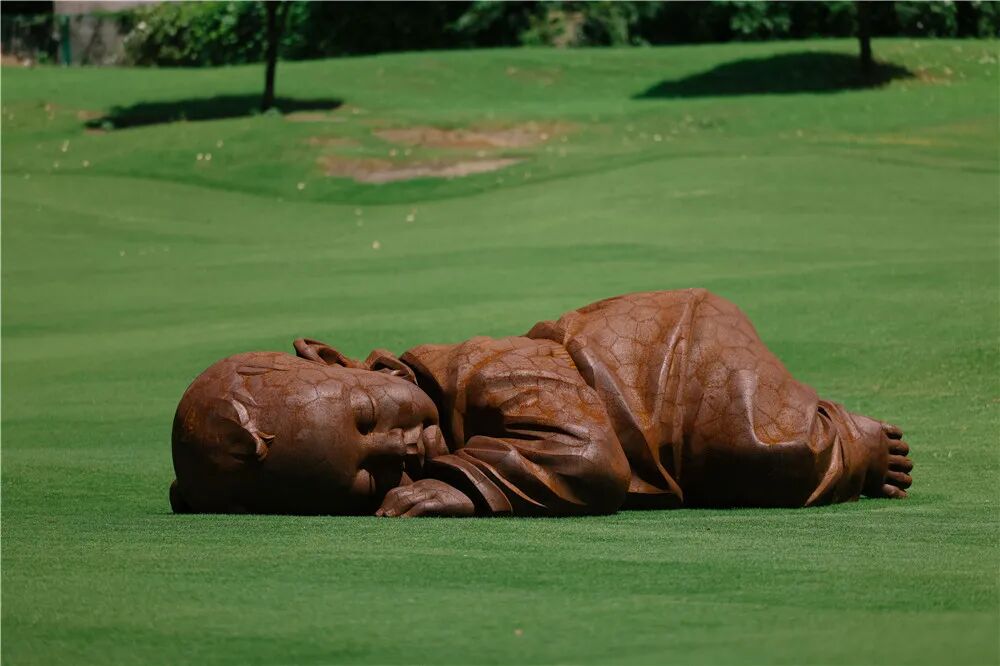 写实放大的婴儿卧在山水间空旷的草地上,艺术家在观者、作品与作为背景的自然三者间,预置了某种令人矛盾的心理感受。