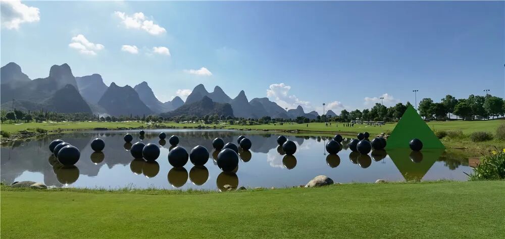 作品运用了自然界中的基本形——圆形与三角形,与作品背景长卷般的桂林山水碰撞出了带有抽象意味的超现实感。