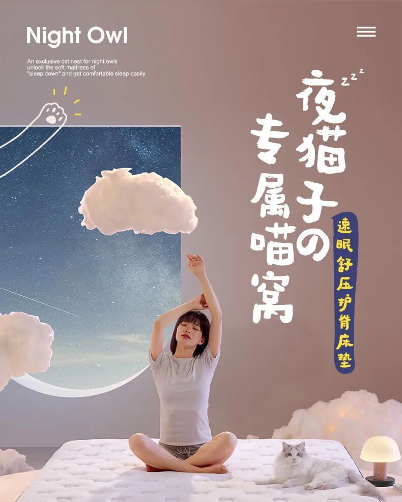 不论你是游戏夜猫子、追剧夜猫子,还是吃货夜猫子,都能在这支视频中找到自己的影子,不仅极大地引发了夜猫子群体的共鸣,也巧妙带出了喜临门床垫的功能卖点,并将“晚睡更要睡得深”的理念传递给大众。