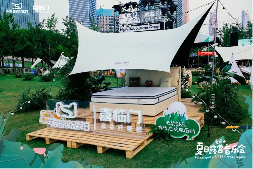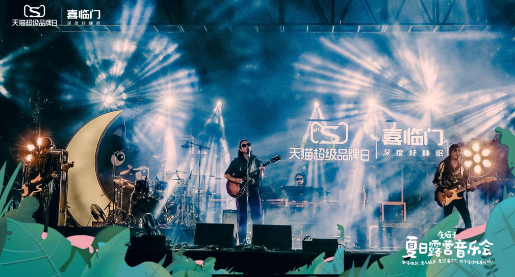除了在线上话题互动外,喜临门联合天猫超级品牌日,邀请达达乐队&海龟先生乐队,为熬夜成瘾的年轻人打造了一场沉浸式的“夜猫子夏日露营音乐会”。