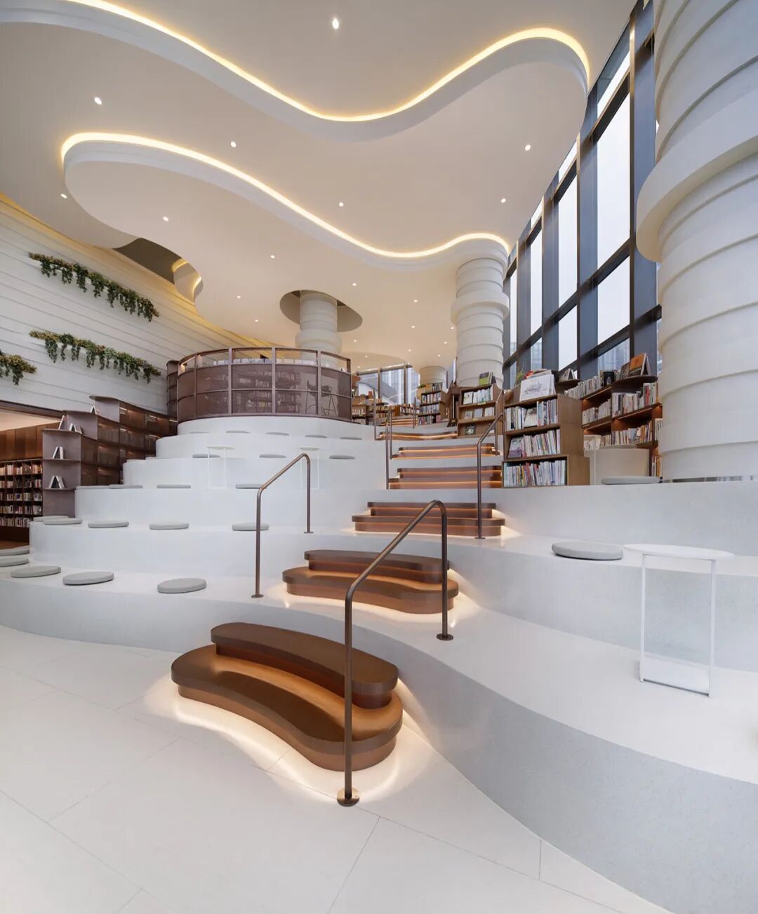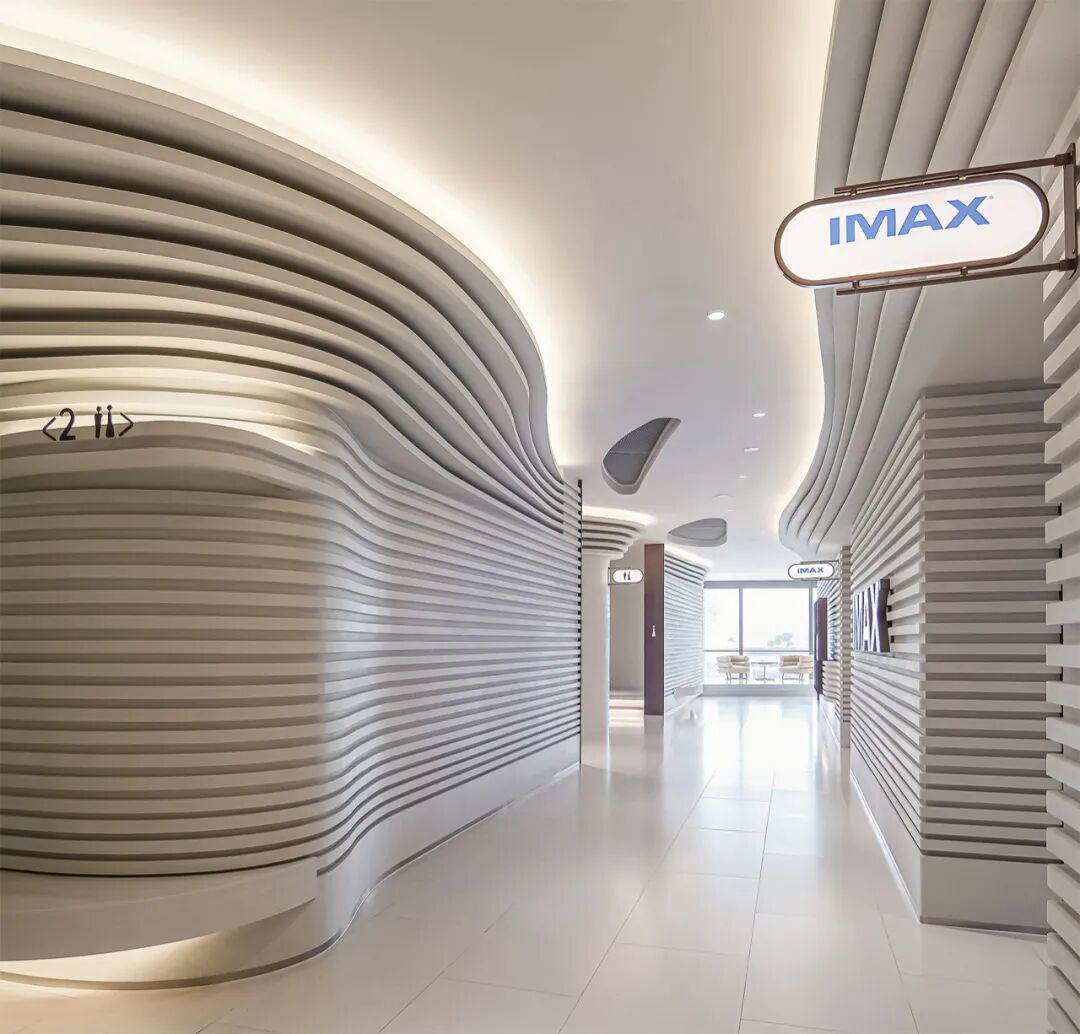 前滩太古里阡陌交错的开放式建筑群形似山谷,为保持室内外空间的连续性,芝作室将外立面的层叠样式延伸到总高3层的影院内,创造出一个人工“峡谷”。