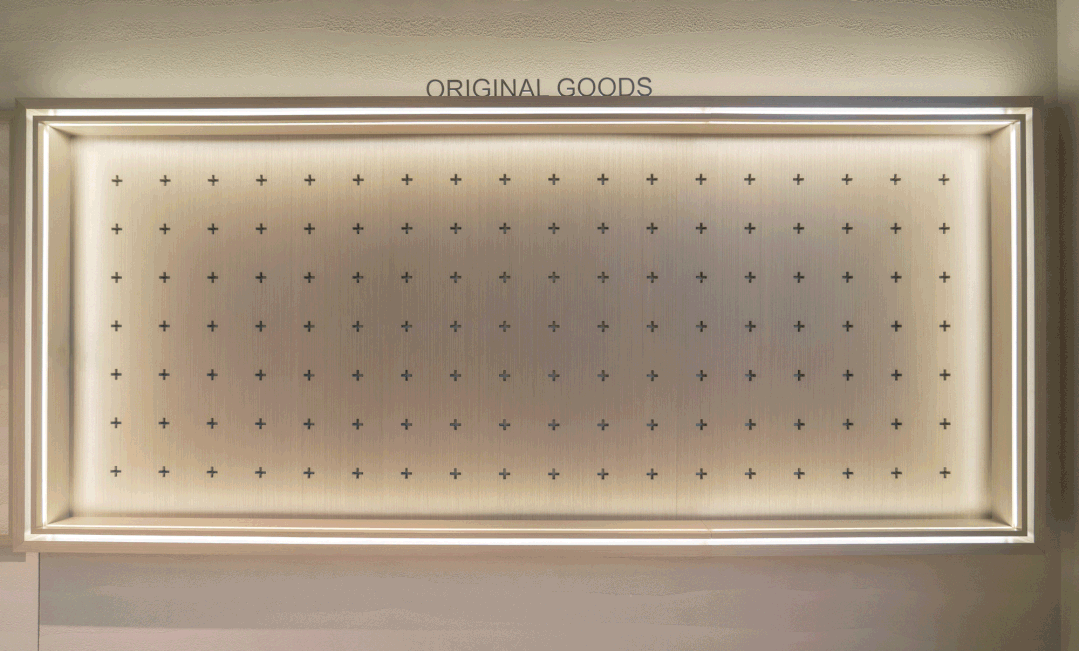 墙面展区用木框架打造,再针对不同展示内容设计相应的道具。产品陈列区由错位的矩形框架组成,并用灯带加以突显。原创周边产品区则用穿孔板与拉丝不锈钢卡件构成,可以变换出不同的组合。