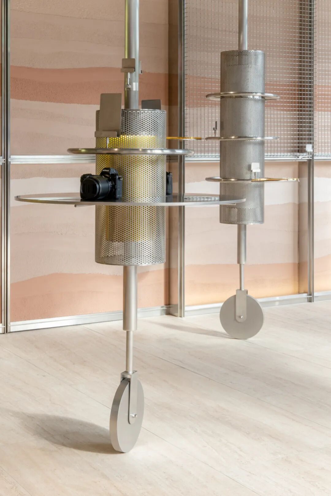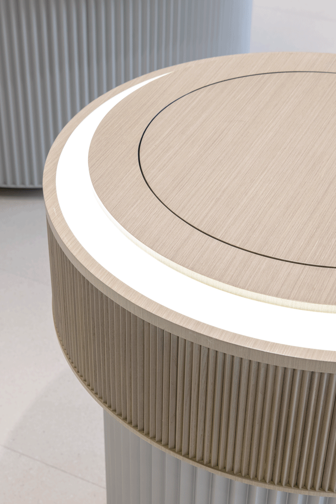 穿孔不锈钢天花层层递进,仿佛由光圈与旋转环组合而成。旋转环之间有通电轨道,让不锈钢展台可以随之自由移动,并为展台供电。展台搭配上环绕四周的网格展架,构成了一套灵活多样的展示系统。