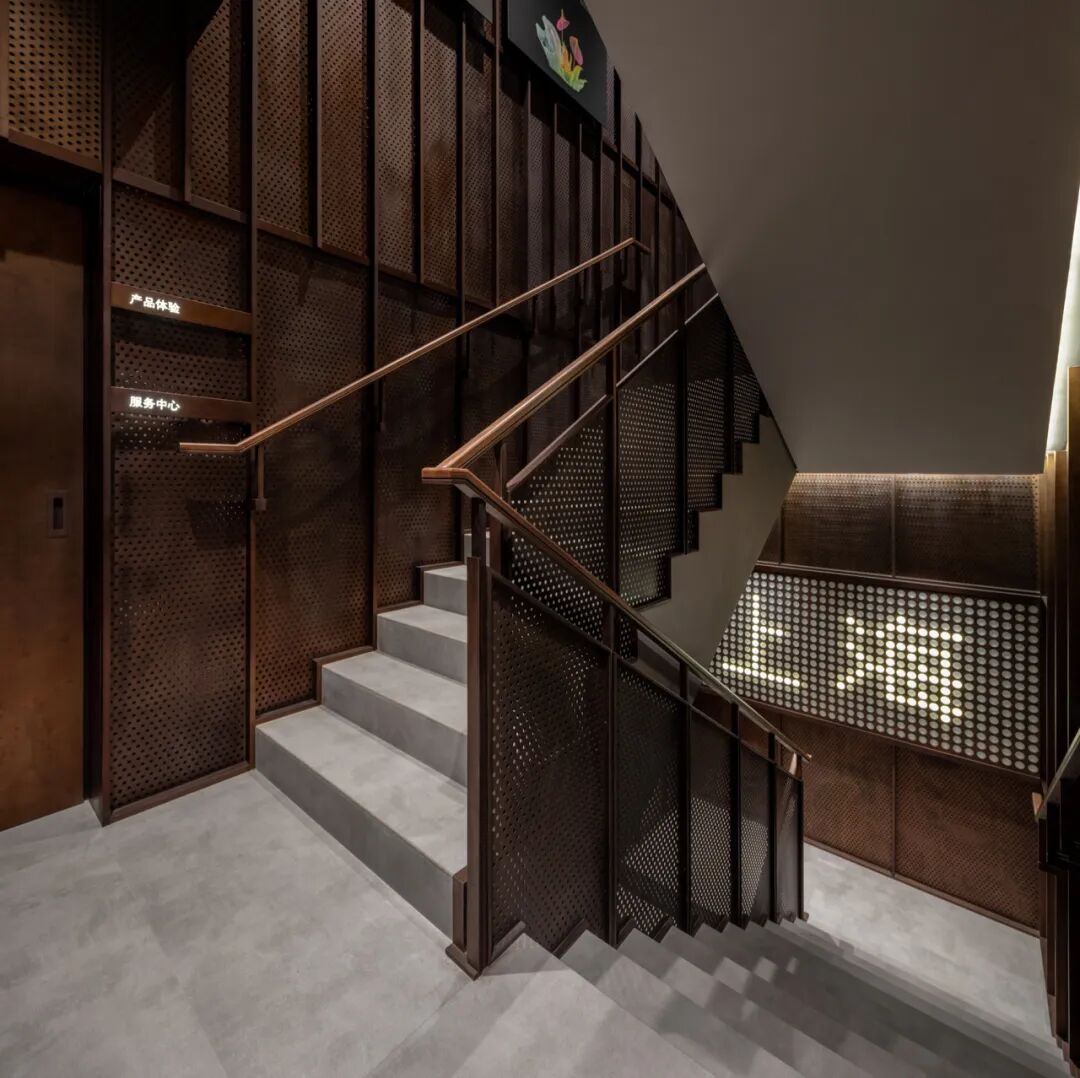 出于对品牌制造业历史背景的呼应,芝作室用工业味十足的材料来打造连接三个沉浸式场景的楼梯间。楼梯间立面以排列整齐的垂直框架为基础,表面覆盖做旧铜色穿孔板,形成“暗室”,为顾客跨越下一楼层进行新的探索提供过渡空间。入口处墙是由629枚光学镜片组成的“上海”灯光艺术装置,标志着这里是尼康开设一系列中国直营店的起点。