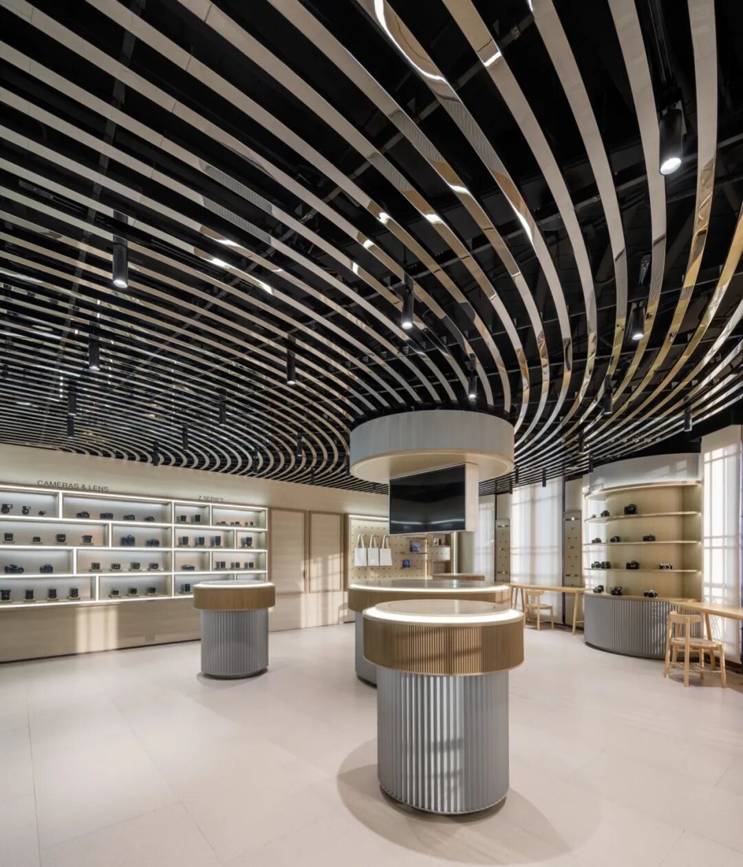 二楼是零售及试用区,展架上陈列着琳琅满目的产品,吸引顾客们端起相机进行试拍。镜面不锈钢条打造的天花,在赋予空间未来感的同时延伸视觉。展厅中央矗立着四个圆形展台,表面的槽纹设计灵感源自相机变焦环。