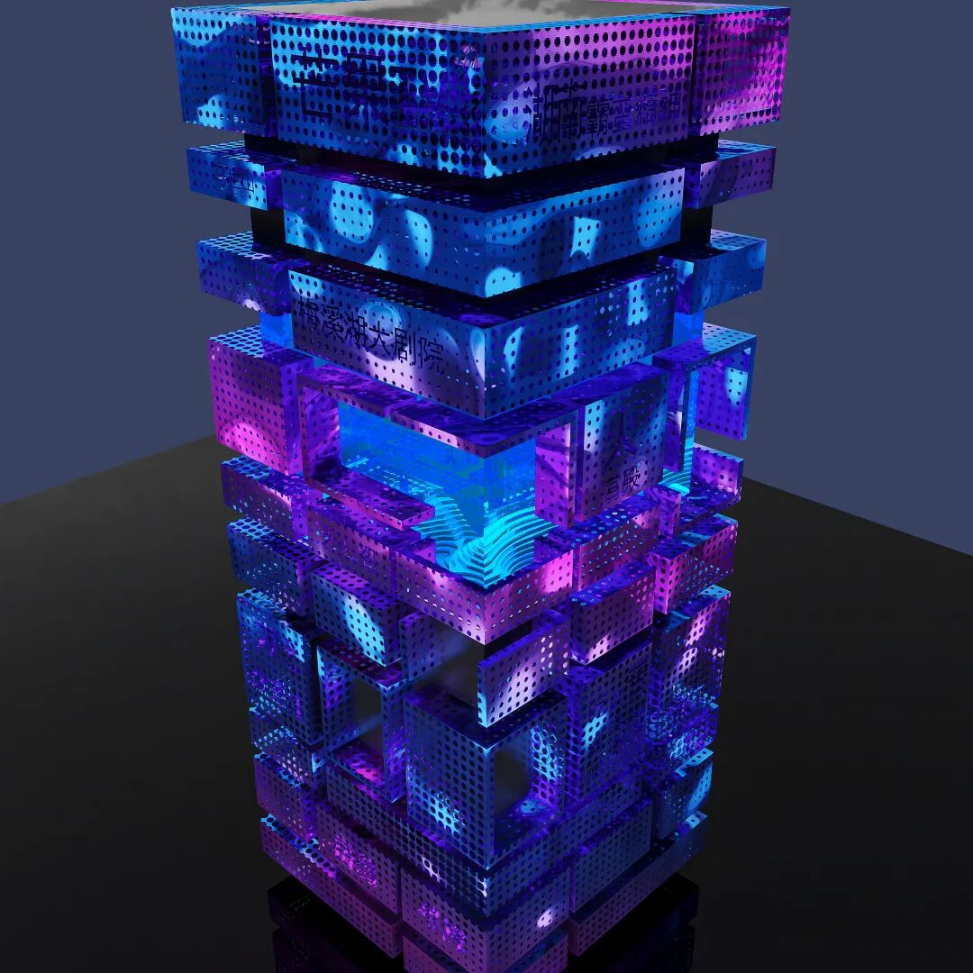 建筑模型代表长沙这座名片,数字化炫彩LED屏幕,具有数字时代媒体的肌理以及长沙地域特色文化标签。