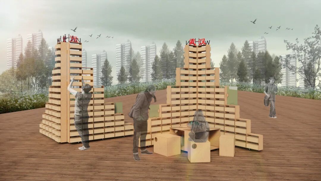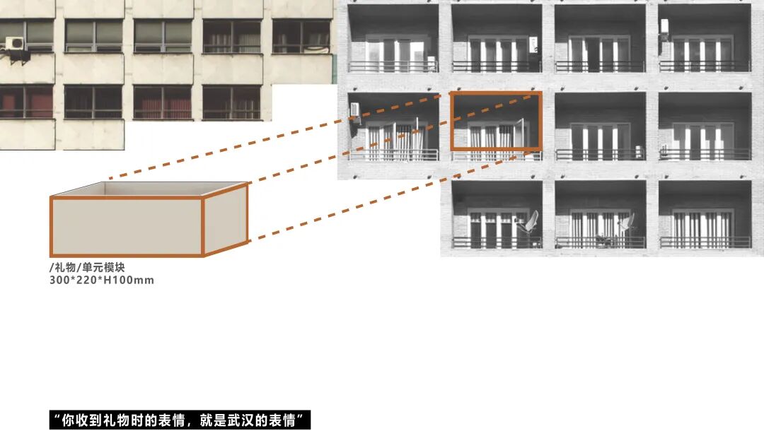 装置以城市最常见的/高楼 窗口/为形态基础,柜体、纸盒,模块化组装看似单调却内藏惊喜。规制的盒子内,是由武汉的设计同行、合作商、及各业朋友们共同筹备的礼物。