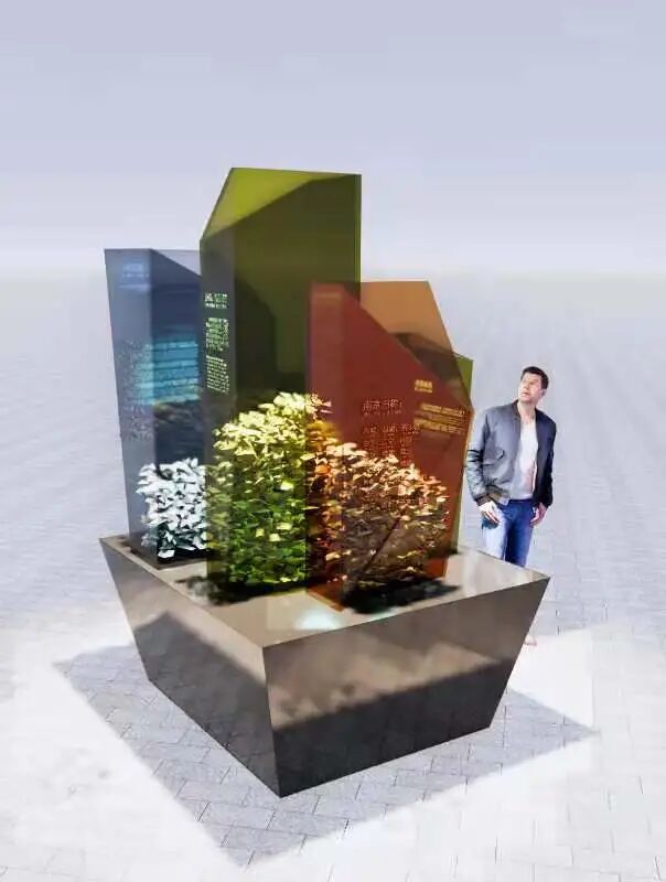 五只盒子,有三只是绿色的,那是因为,南京是中国“园林城市”之最,是一座非常宜居的公园城市。其中橙红色的盒子,象征着现代城市的欣欣向荣,而那只灰色的盒子,是我们对南京大屠杀曾经的灰色记忆,也是我们不能忘却的过往,激励着我们一路奋进、砥砺前行。
